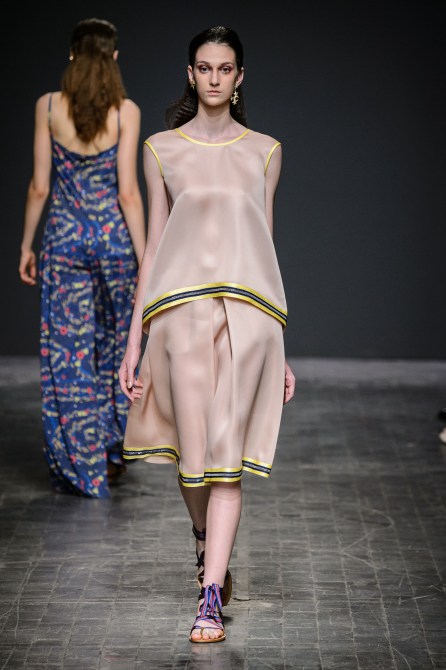 É su queste basi, bagnate di brezza estiva e da sensuali profumi, che prendono vita long dress in crepe de chine e crepe cady, stretti in vita da sottili fiocchetti in organza; leggeri e delicati gli intrecci dal sapore demi-couture per top in maglia e lurex e per le jumpsuite in popeline di cotone; impalpabili e vaporose le camicie e le pencil skirt in tulle e organza barrè.
