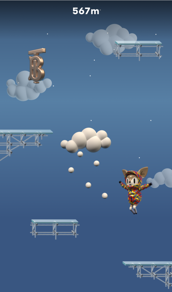 In this engaging and playful game, players race a deer-shaped character to the moon, using supercharged Thomas Burberry monogram puffer jackets. Once the player has selected a puffer jacket for the character, they bounce upwards between platforms to reach the moon, gaining extra speed by collecting Burberry’s gold TB logos and drones along the way.