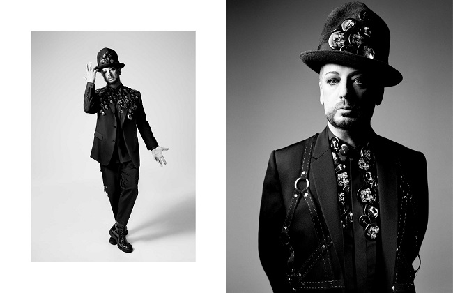 Boy George, rappresentante di un altro capitolo mitico della storia musicale, unisce stile sartoriale, imbracature a taglio vivo e badge con il suo stile unico, immutato dai tempi delle notti del Blitz Club.