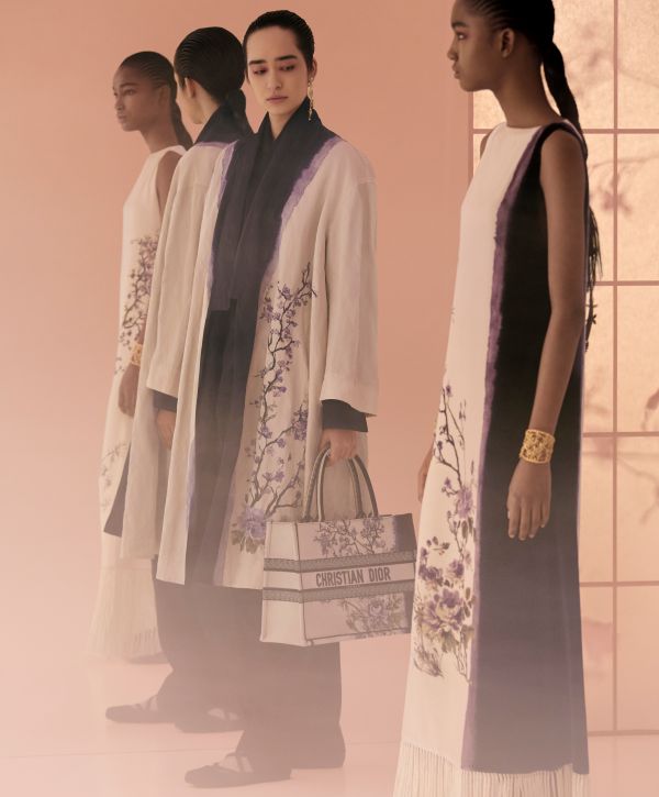 In a dreamlike atmosphere, where fantasy and reality appear to coexist, the evanescent Dior silhouettes are staged through an entrancing interplay of mirrors, perspectives and reflections, translating the different facets of femininity, between power, delicacy and sensitivity. The harmonious fusion of Japanese savoir-faire and French couture is unveiled through designs that revisit the traditional kimono jacket, with its ample and enveloping lines adorned by an enchanting garden sketched on silk.