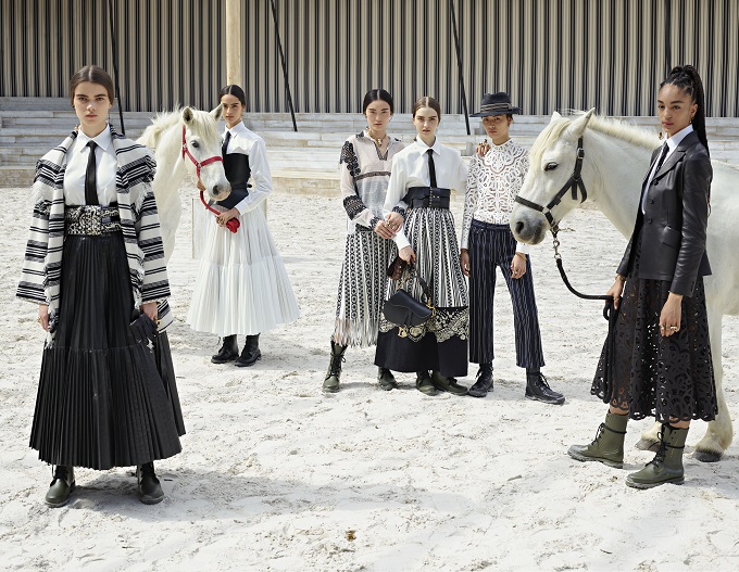 La forza di quelle donne schierate insieme – che riporta la solidarietà femminile a una forma di libertà creativa comune, condividendo sapienze artigianali – ha spinto Maria Grazia Chiuri a recuperare una serie di materiali e lavorazioni tipiche, e a ricondurle in una dimensione di savoir-faire contemporaneo. Ma è stata soprattutto la bellezza inquieta dell’immagine della donna amazzone, che dall’antichità arriva ai giorni nostri, a farle esplorare quella declinazione del vestire che nella dimensione sportiva travalica i generi. Sono allora le straordinarie interpretazioni della giacca da amazzone, in cotone giapponese tipo chino o in nero, abbinata a pantaloni di diverse fogge, a gonne pantalone oppure a gonne che rievocano, nel virtuosismo di pieghe, rotazioni e ampiezze, il modello Drags proposto da Christian Dior nel 1948. L’iconica borsa Saddle viene rivisitata da Maria Grazia Chiuri. Ed è una camicia maschile bianca, oppure a righe, con la sottile cravatta nera, a completare la mise.