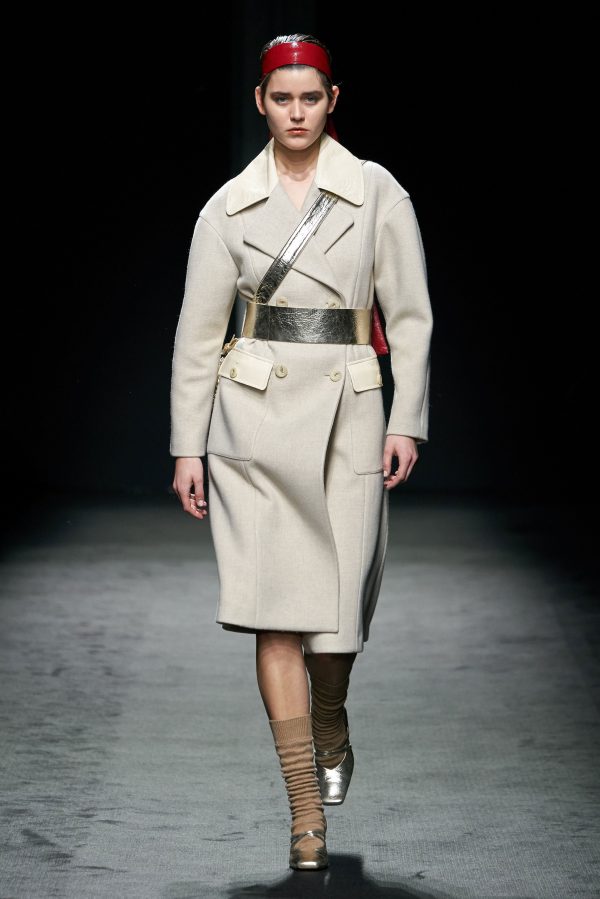I cappotti e gli spolverini assumono un ruolo centrale, rielaborando il trench di ispirazione anni ’80 attraverso ampi volumi e spalle accentuate. Vestiti sofisticati e drappeggiati intrecciano seta e pelle e sono animati da delicate arricciature.
