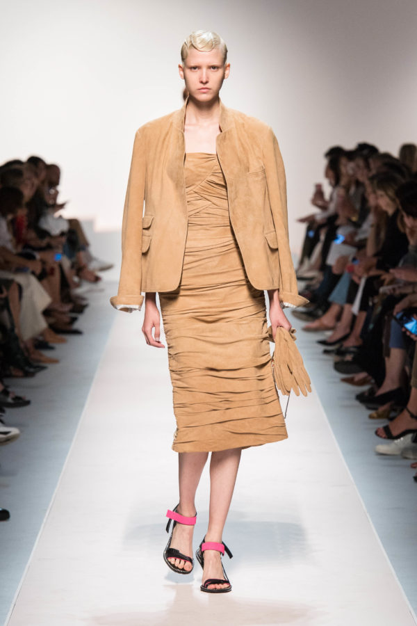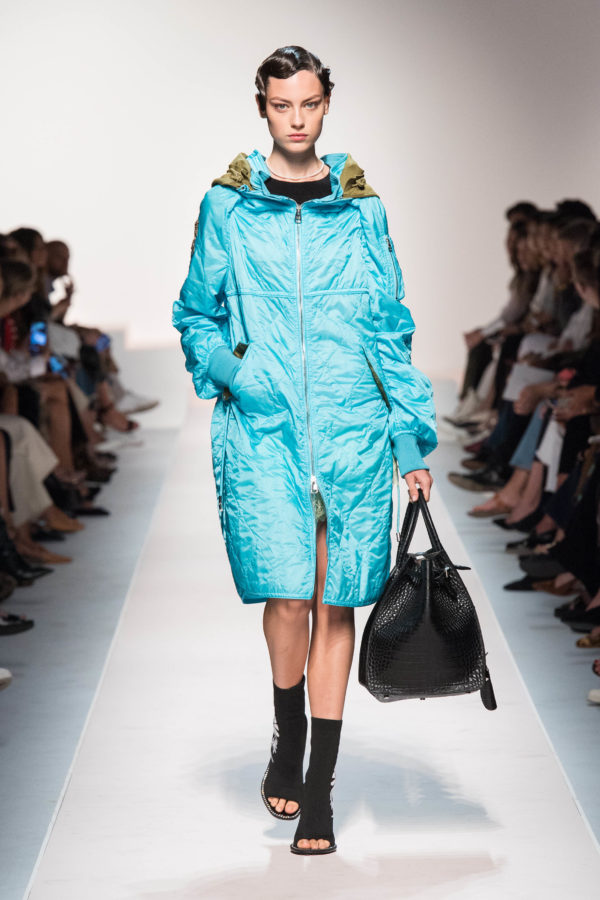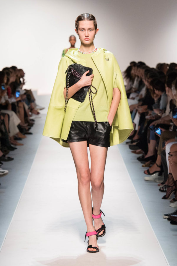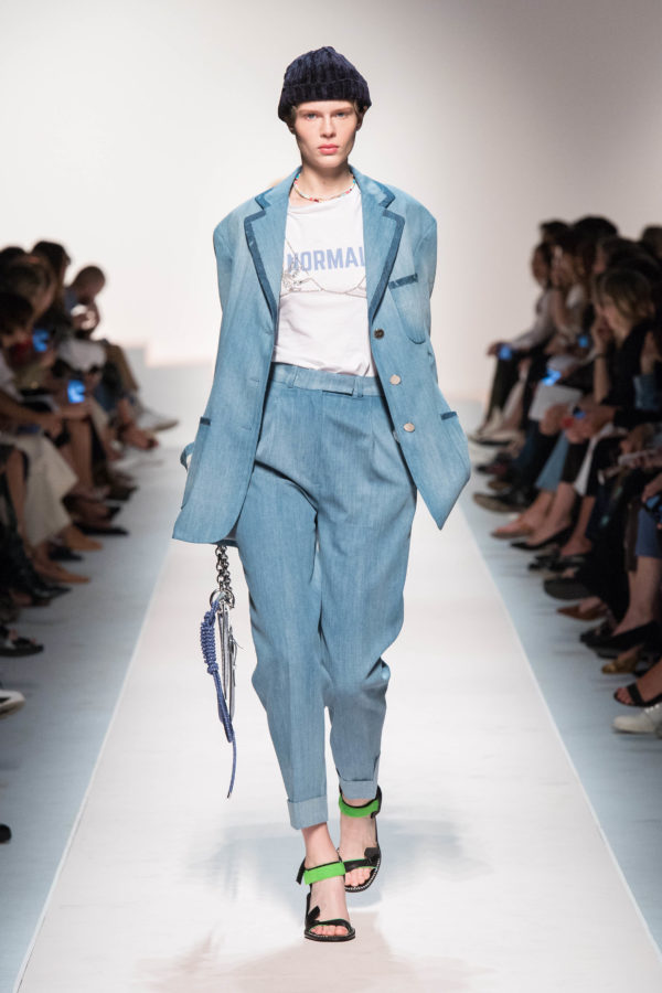 La sartorialità, mai fine a se stessa, diventa sport. La pelle, morbida come seta, è usata per abiti, tute e giacche dai colori brillanti. Il jeans diventa stampa, anch’essa morbidissima, percorsa da motivi floreali.