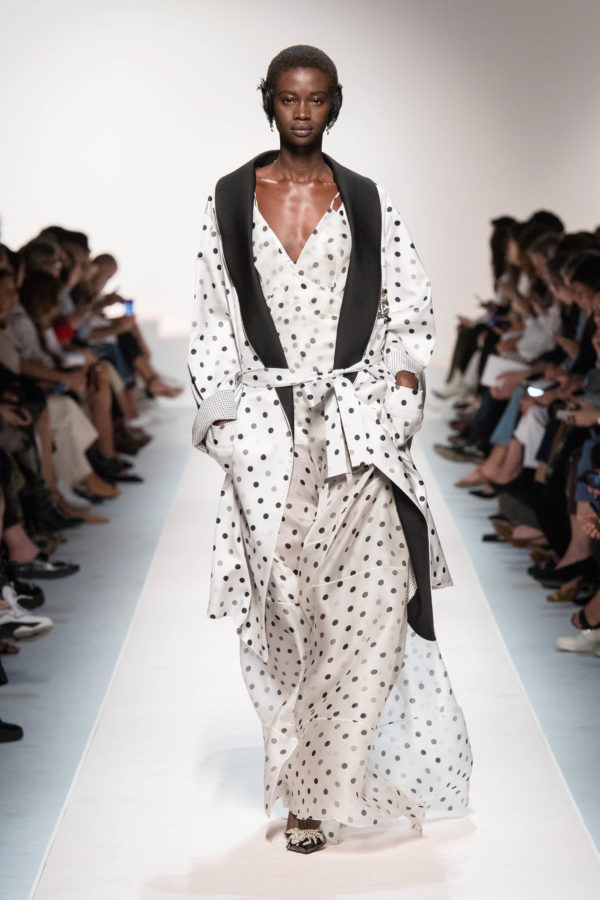 L’intimo come abito pubblico, tratto distintivo della Maison, passa dalle sottovesti alle vestaglie, preziose ed eleganti come abiti. La grande notte diventa la grande sera. In fantasia palma, maculata, rigata, check o a pois, riscrive il daywear in chiave glamour. Lo stesso pigiama, in materiali preziosi, sostituisce con nonchalance la formalità del tailleur.