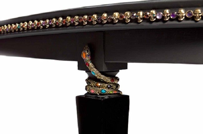 Le proposte ammirabili, tra cui “Tobeornottobe”-Tavoloscrivania, “Birds in black”- Cassettiera, “Bodyarmour”- Comodini, “Watch over me”- Specchio da muro, sono rappresentative di diverse tecniche che qualificano ricerca e sperimentazione. I materiali inediti utilizzati, specchi, cristalli, lastre traforate, simboli esoterici e segni dello zodiaco, sono espressivi della passione per le scienze esoteriche.