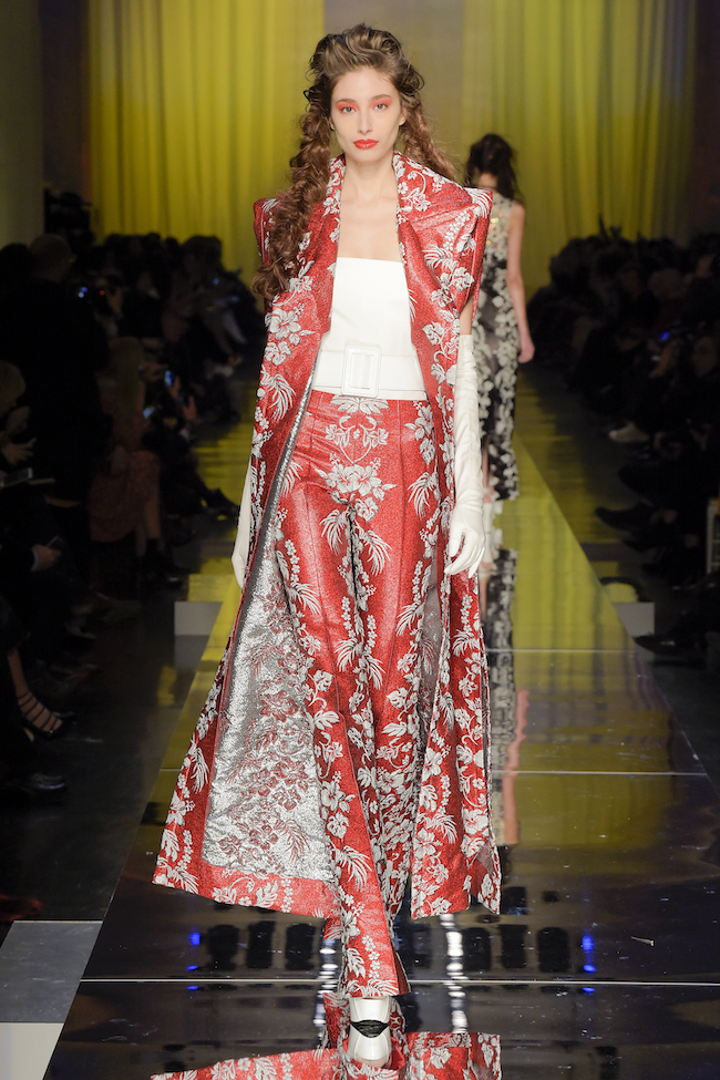 Opulenze latine e stravaganze pittoriche per una dea Cerere dall’incedere giocoso e sexy. La dea dei campi scende dal cielo a fine sfilata e muovendo passi di danza celebra le sue nozze campestri facendosi portare all’altare su una carriola di ferro di gusto neoromantico.