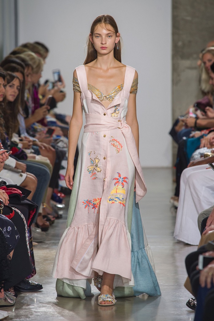 In generale i tessuti sono leggeri e spiritosi negli accostamenti. Il jeans fa la sua apparizione in miniabiti destrutturati e pantaloni tagliati poco sotto il ginocchio che sembrano stati slavati. Le trasparenze non sono mai volgari, merito forse delle toppe a ricamo applicate con sapiente disinteresse.