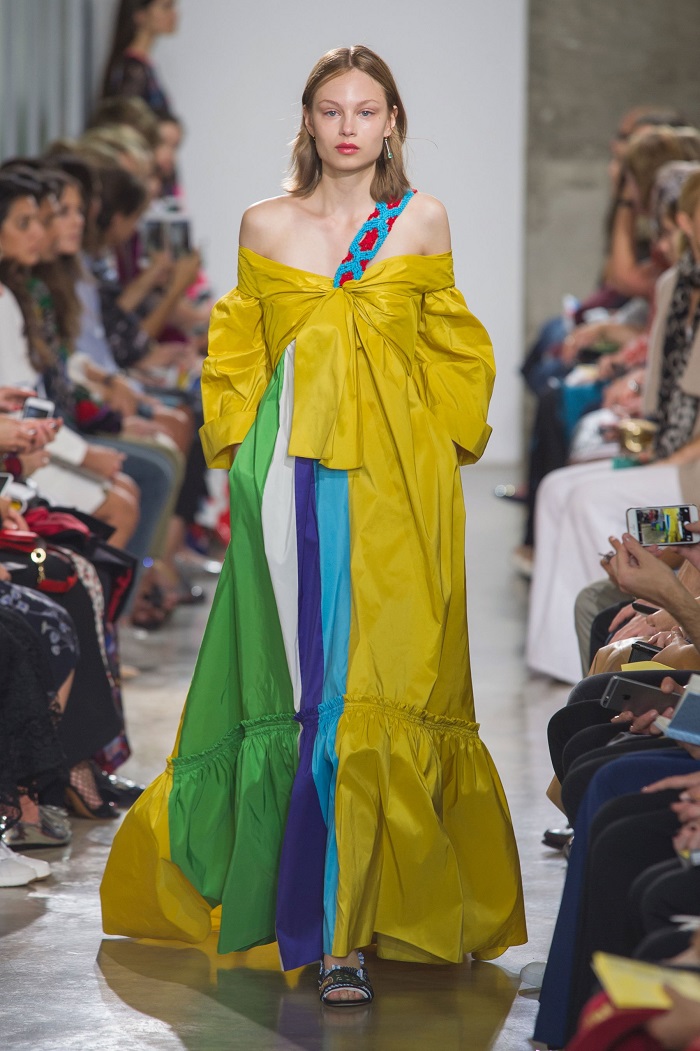 Sono i colori del Messico e le gonne ampie e ricamate all’inverosimile a colpire innanzitutto nella collezione di Peter Pilotto che mescola tessuti pieni e trasparenze in un caleidoscopio frizzante.