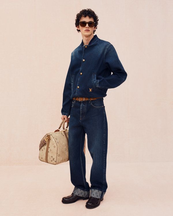 Chapter two of the collection transitions into a summer-centric park wardrobe. Light tailoring such as a brick-coloured, half-lined, relaxed linen suit or a navy linen double-breasted shirt mixes with loungewear: short-sleeved shirts, loungewear trousers and boxer shorts; some in striped silk jacquard with a delicate Monogram effect. The subtle take on the House’s iconography is also interpreted in dynamic Monogram fragments integrated into stripes, exercised in a track jacket, shorts and t-shirts. The Monogram further appears in patchworked check shorts and a denim-print coach jacket with shorts, and in a pastel tonal version in jacquard cotton-poplin shirts and shirt jackets. Raffia is evoked in Damier-patterned yarn in a blouson, a cardigan and a hand-crocheted polo shirt. Outerwear captures an artist spirit: a collarless cotton jacket with rope trims, a blouson spliced with knitted cable panels, a crimson coach jacket, and a khaki suede blouson worn nonchalantly with a shirt and distressed cargo shorts.