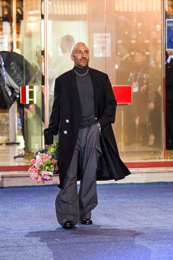 Luchè ha indossato un dolcevita in cashmere abbinato a pantaloni cargo impreziositi da un motivo a quadri e da perline scintillanti ricamate. A completare il look, un soprabito sartoriale monopetto in stile kimono e stivaletti Chelsea LV Oxford.