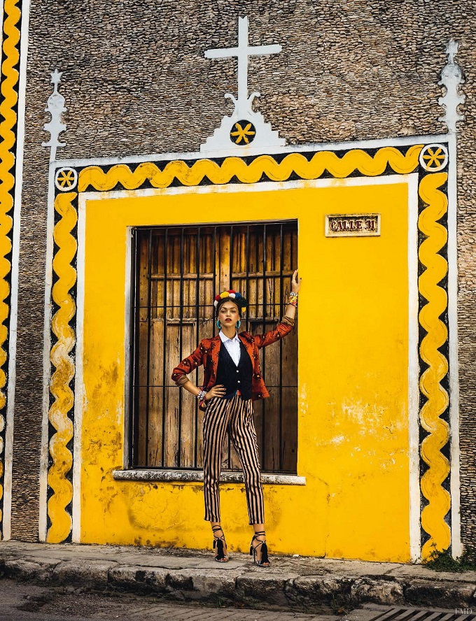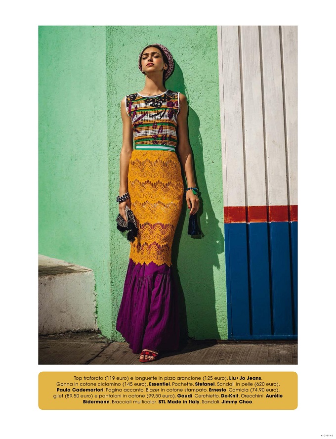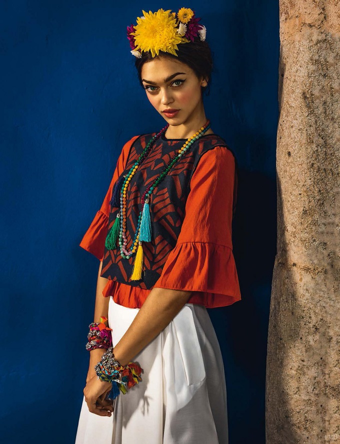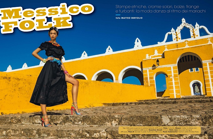 Folk style gets a fashionable update in the June 2016 issue of Glamour Italy. Model Zhenya Katava poses in Mexico wearing traditional styles full of embroidered pieces and colorful headpieces. Photographed by Matteo Bertolio and styled by Andrea Fiore, the brunette stunner models the designs of Dolce & Gabbana, Missoni, Stella Jean and more.