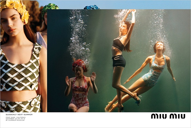 Miu Miu presenta la nuova campagna pubblicitaria primavera estate 2017 “Suddenly Next Summer”, la terza campagna scattata dal fotografo Alasdair McLellan. Per la nuova stagione il fotografo inglese lavora con l’attrice Elle Fanning e un cast di donne composto da nuovi talenti ed icone della moda come: Sonia Ben Ammar, Elsa Brisinger, Karen Elson, Birgit Kos, Carolyn Murphy, Mayowa Nicholas, Ellen Rosa, Lara Stone.