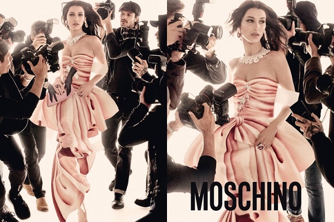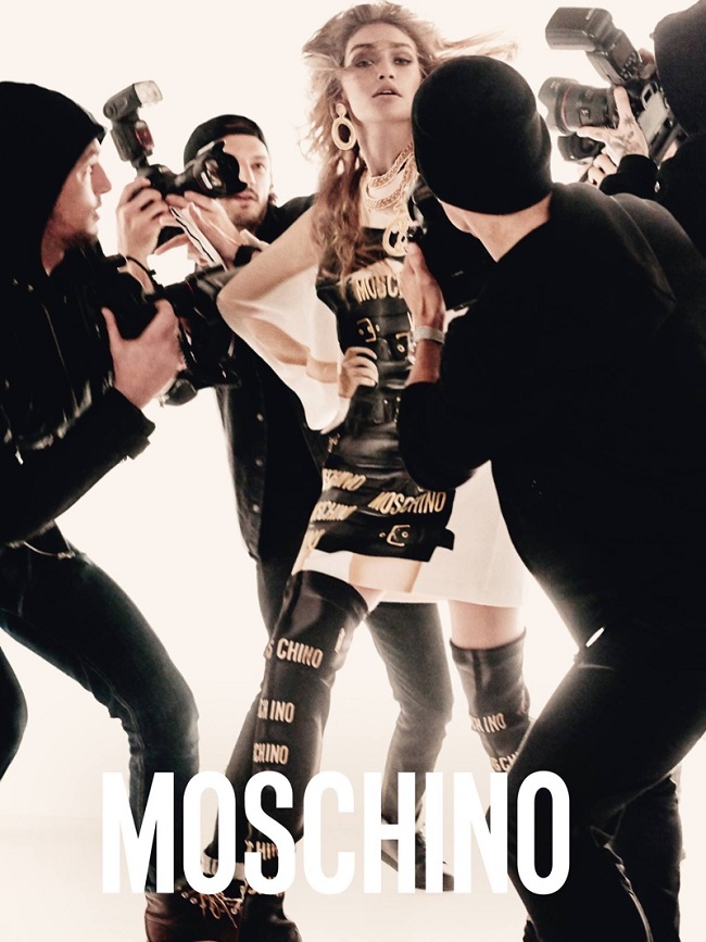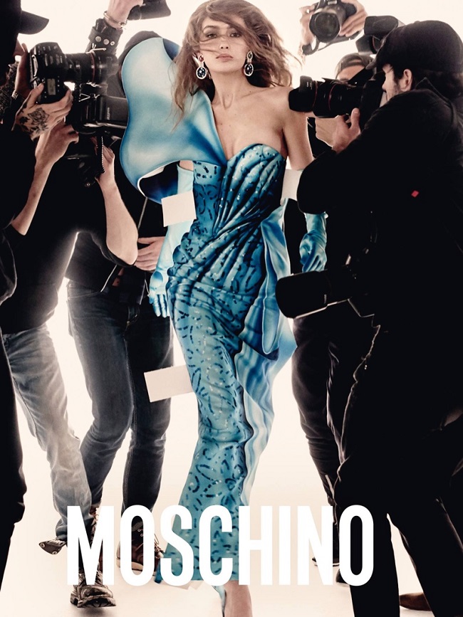 Fotografate come due dive, seguite da uno stuolo di paparazzi, le bellissime top model riportano il brand Moschino al glamour degli anni Ottanta. In bilico tra la Milano da bere e gli anni Novanta, quando le supermodelle erano acclamate come personaggi, Gigi e Bella Hadid posano come due femme fatale, tra i flash dei fotografi che le seguono ad ogni passo.
