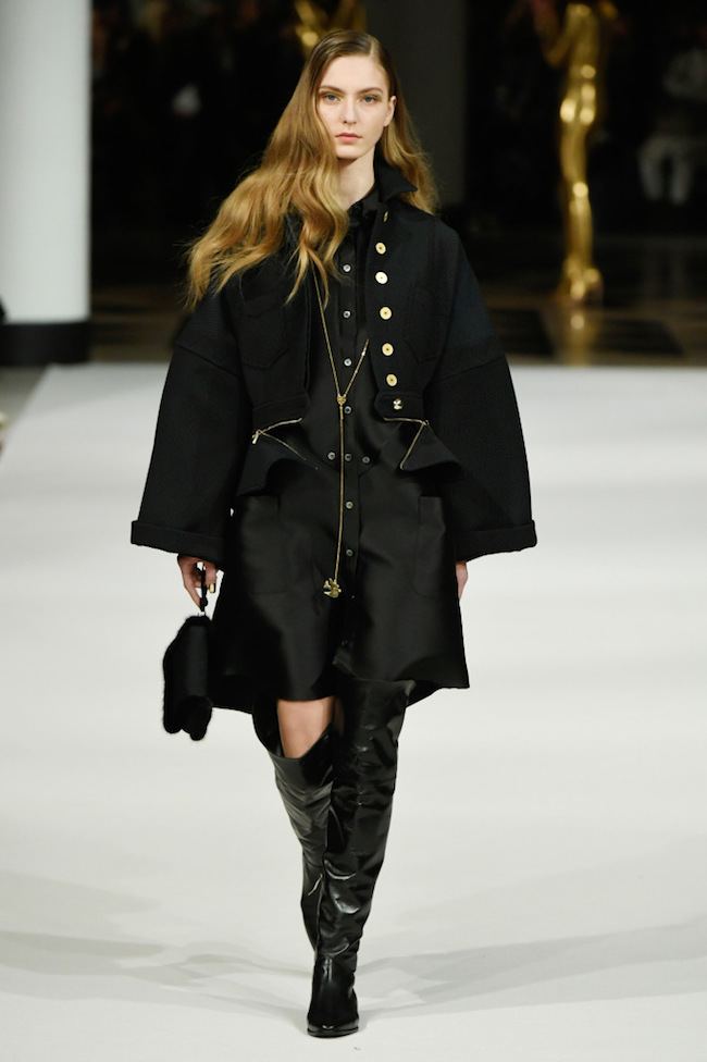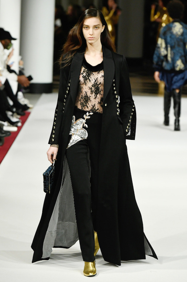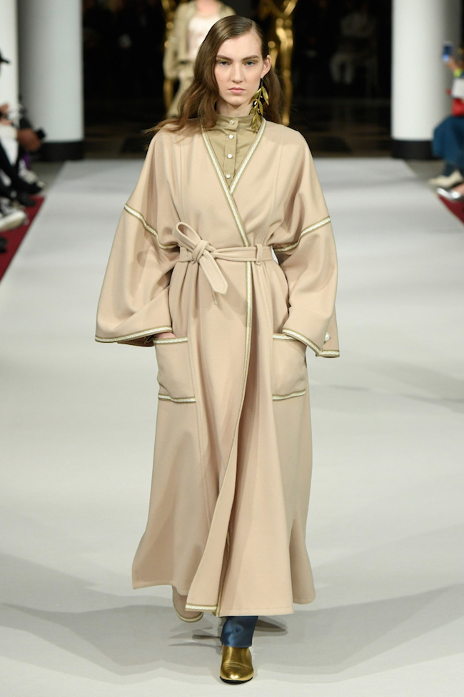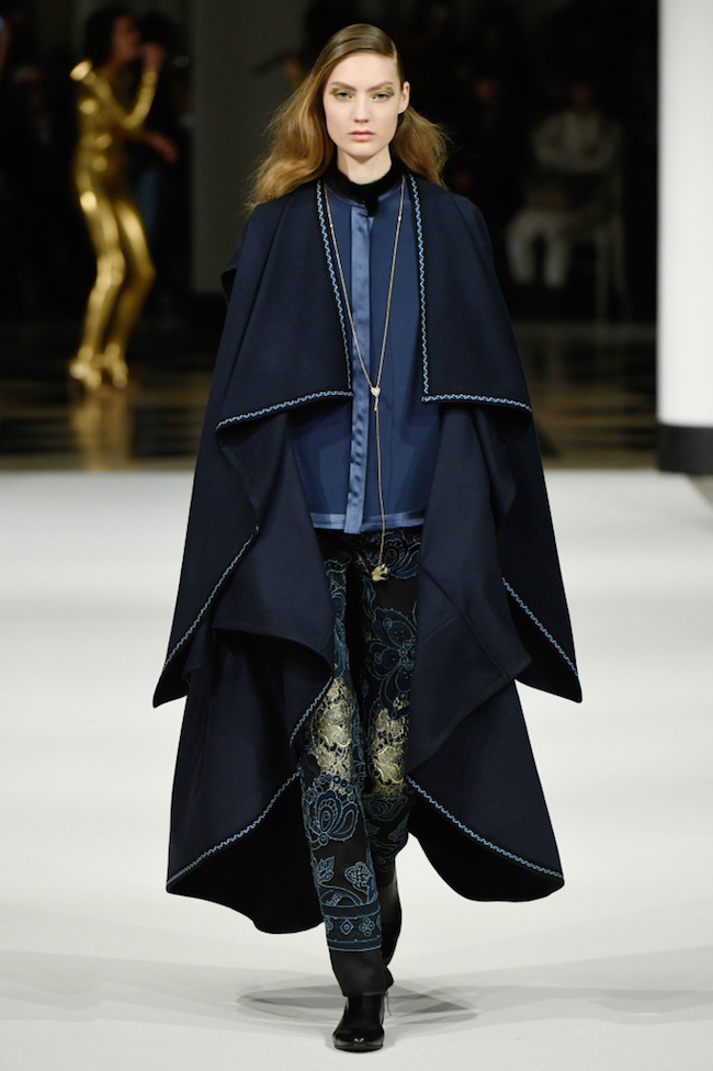 L’eredità traspare nei volumi, nel cappotto rettangolare di cashmere, nell’uso delle nuance royal blue. Il broccato sontuoso è un must-have della collezione appena presentata, il soprabito destrutturato, la lana accostata all’oro lamè.