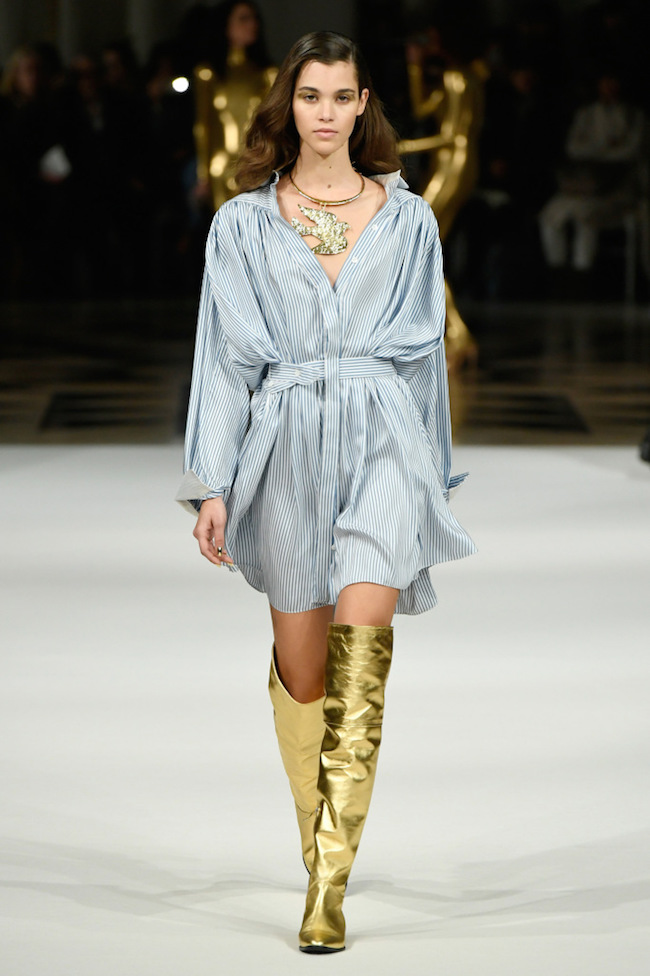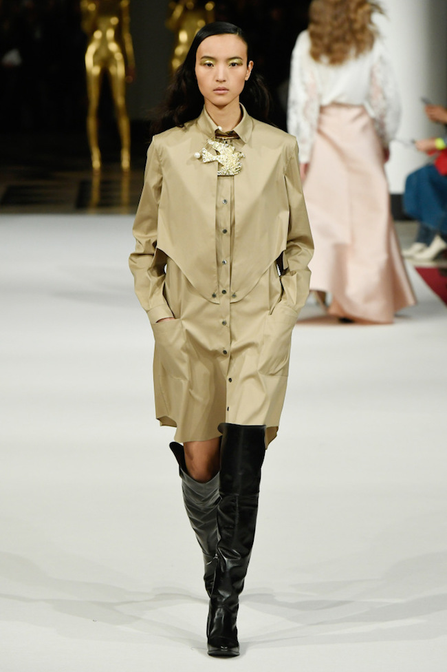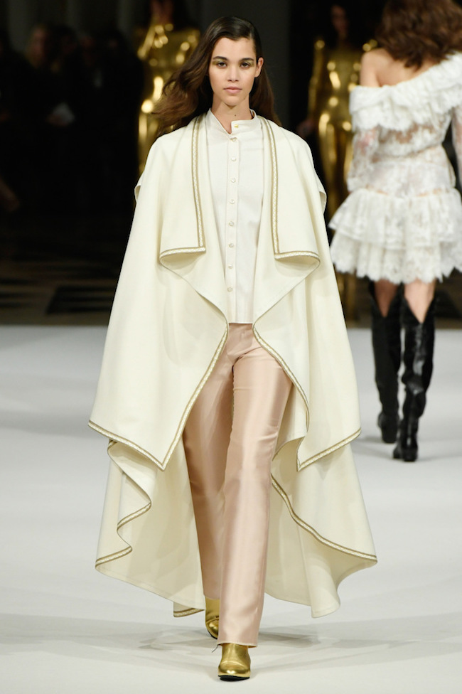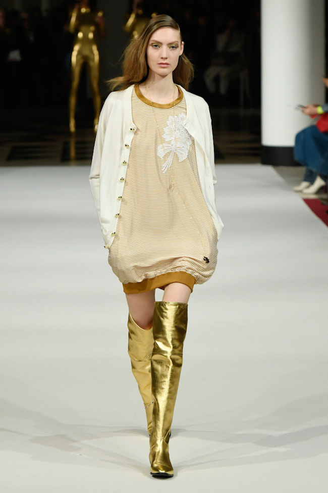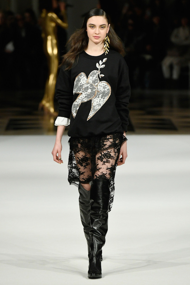 Una sfilata fra rami d’ulivo e colombe. Ricca di simboli e significati protagonisti di abiti ed accessori. L’oro lo troviamo negli alti stivali, nelle bluse, nelle giacche.