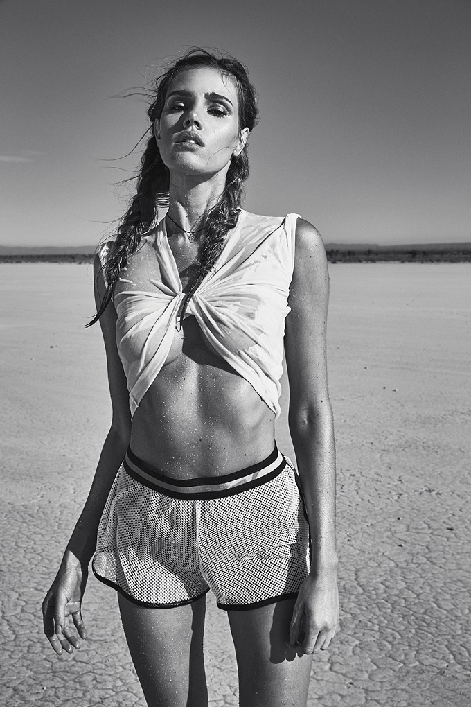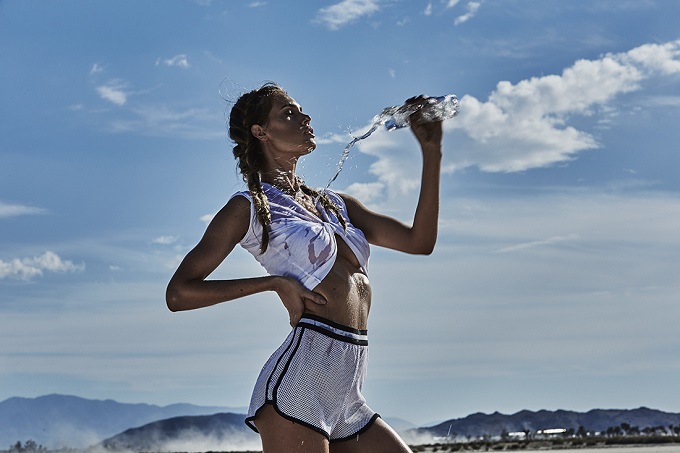 Danielly Silva is hard at work in the middle of the California desert as she jumps and drags tires in Alexander Wang trainers paired with Balmain gloves, styled by Ali Dariotis. With the sun at its highest point in the sky, Silva cools off with a shower from her water bottle, shot by Josh Ryan.