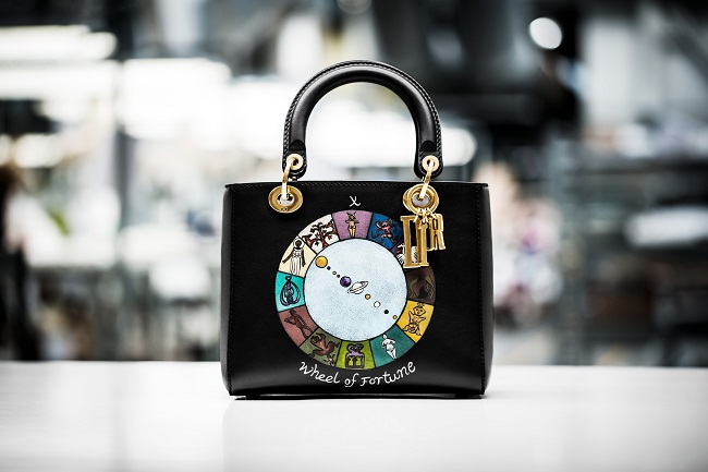 Tutto in lei richiama il miglior savoir-faire pellettiero. Questa edizione limitata in pelle di vitello liscia nera svela un disegno dipinto a mano della carta “La Ruota della Fortuna” dei tarocchi “Motherpeace” immaginati da Karen Vogel e Vicki Noble.