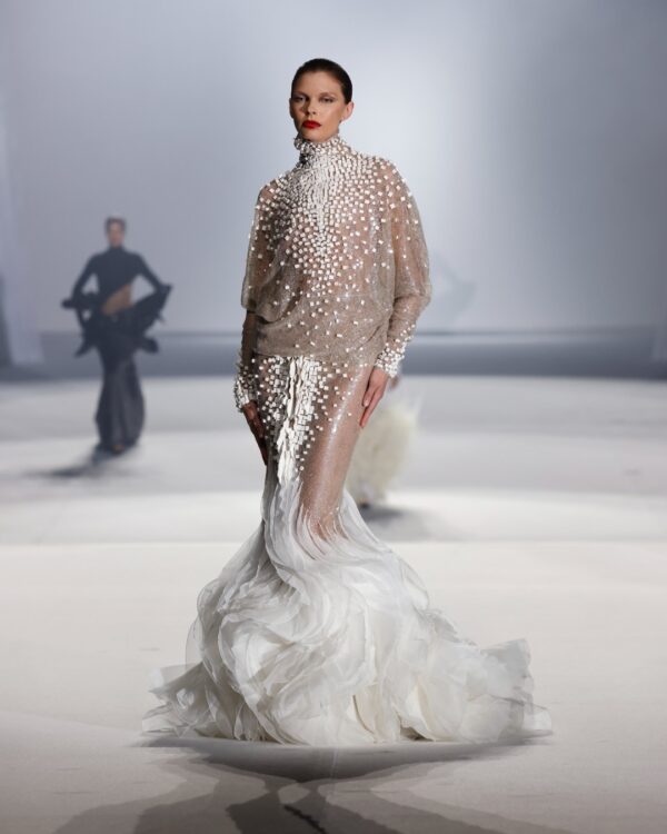 Evening pyjamas, kimonos, and caftans embroidered over transparent organza pants.