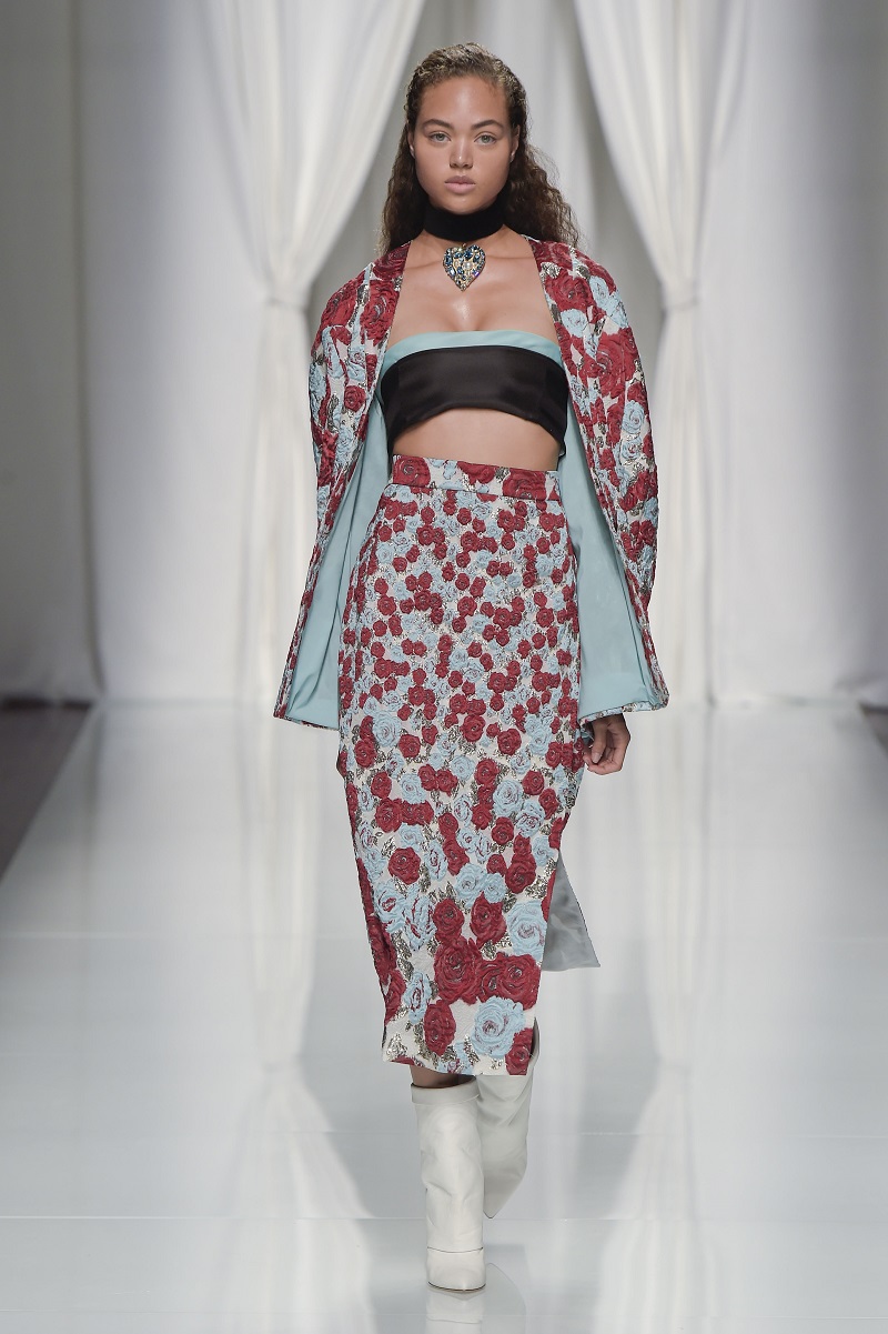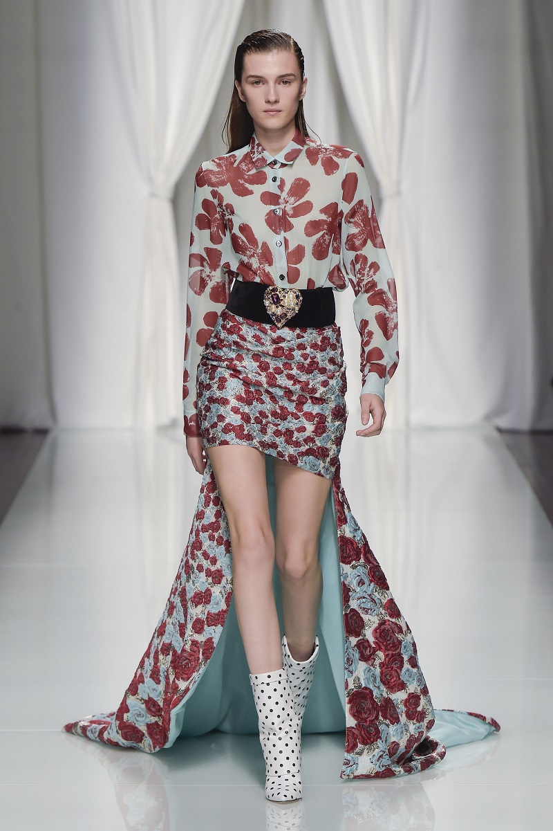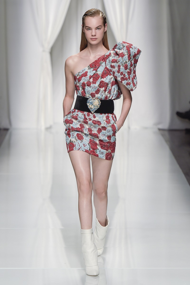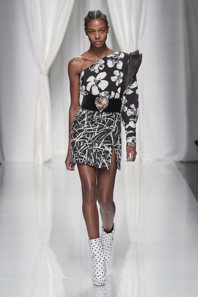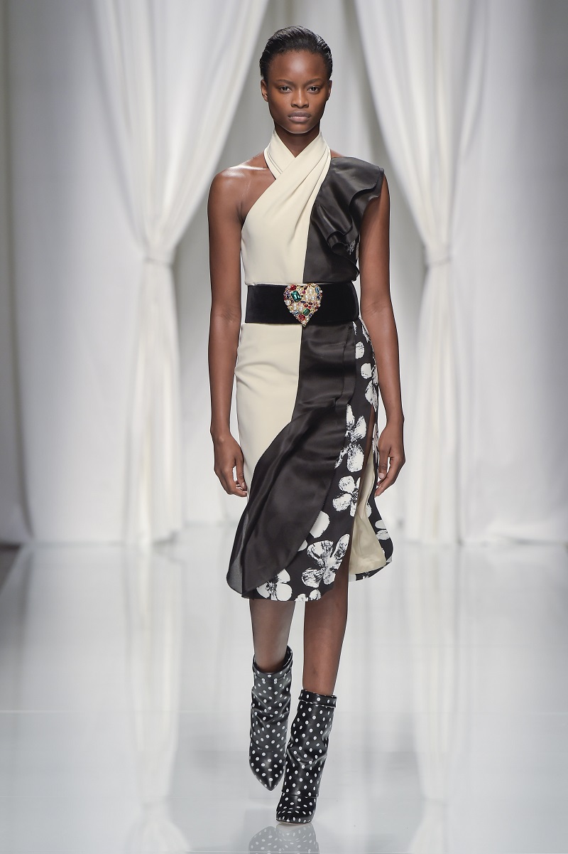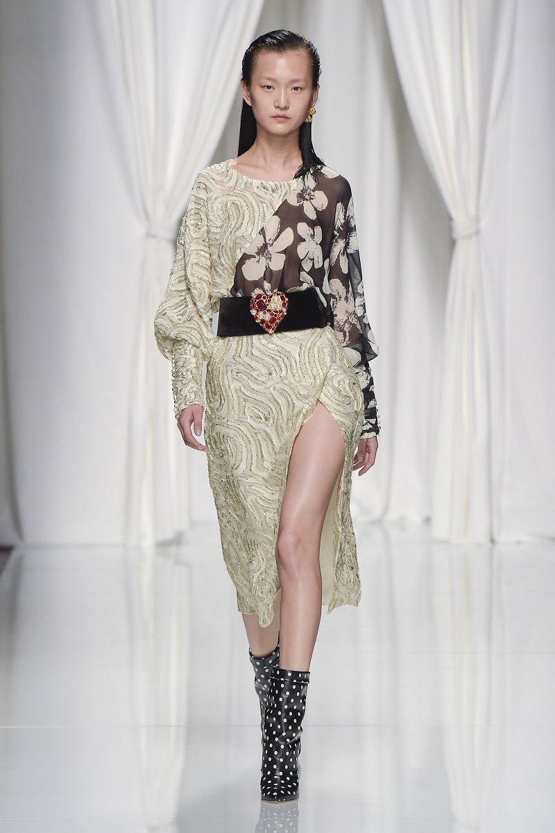 Grafismi floreali rivestono il tubino monospalla stretto in vita, ricami di pois tridimensionali si stagliano su una base di paillettes per le gonne dal back grafico, caban budoir sono accostati a gonne sharp.