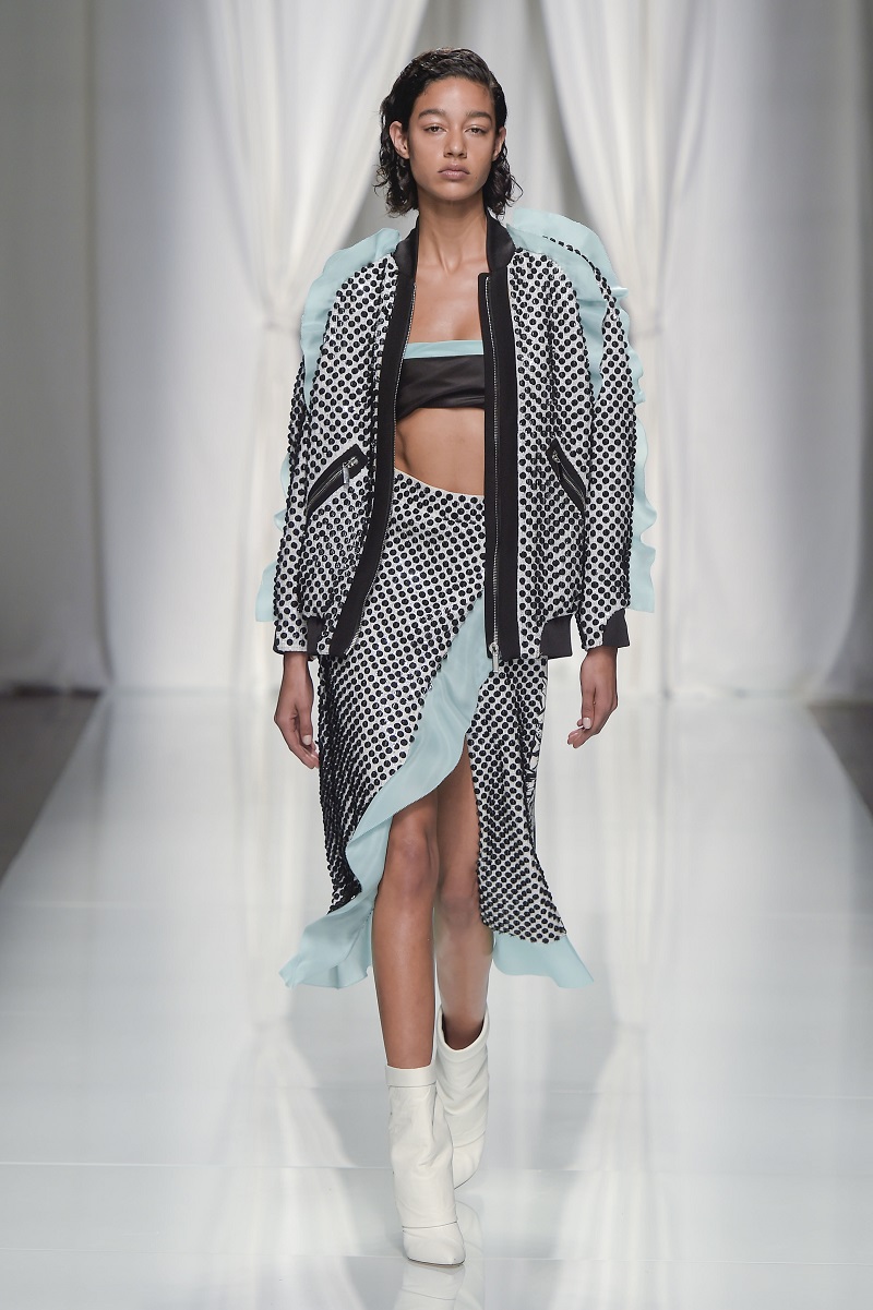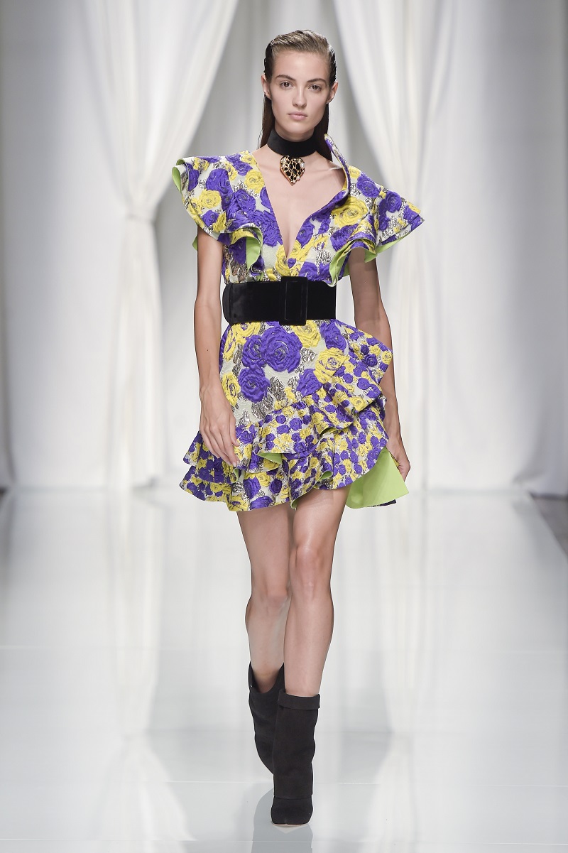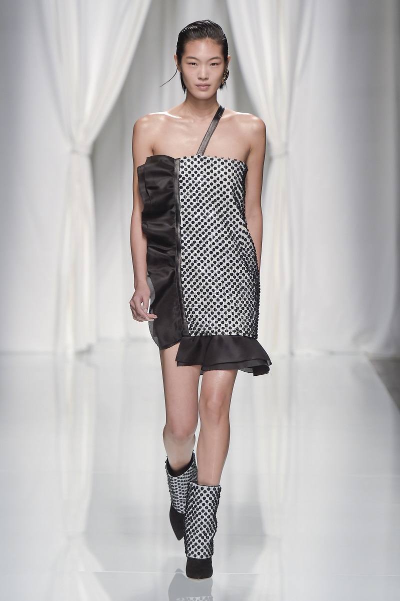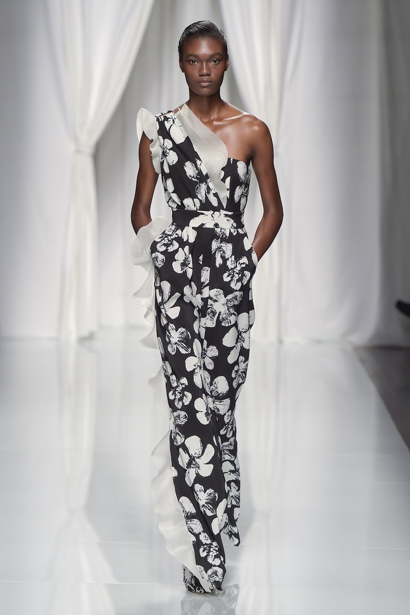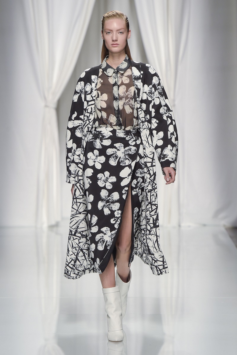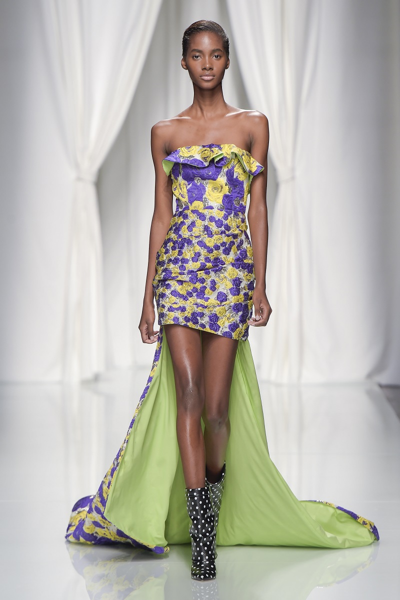 Grafismi floreali rivestono il tubino monospalla stretto in vita, ricami di pois tridimensionali si stagliano su una base di paillettes per le gonne dal back grafico, caban budoir sono accostati a gonne sharp.