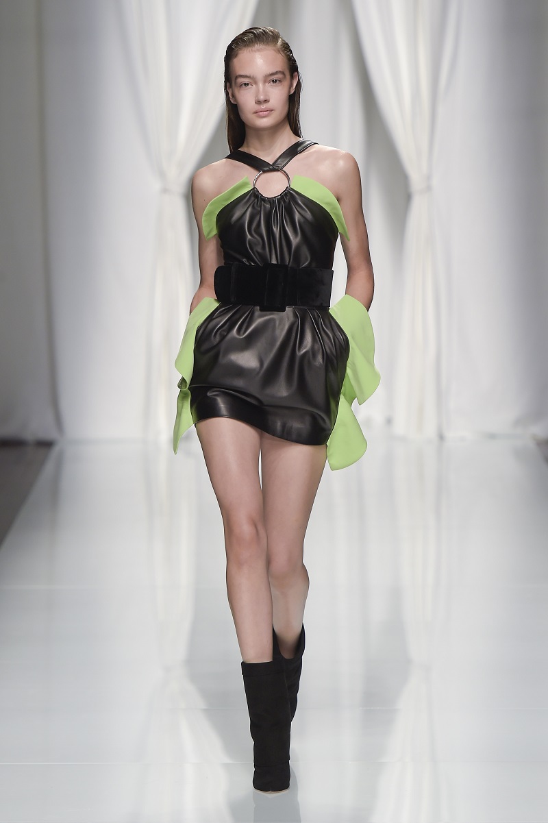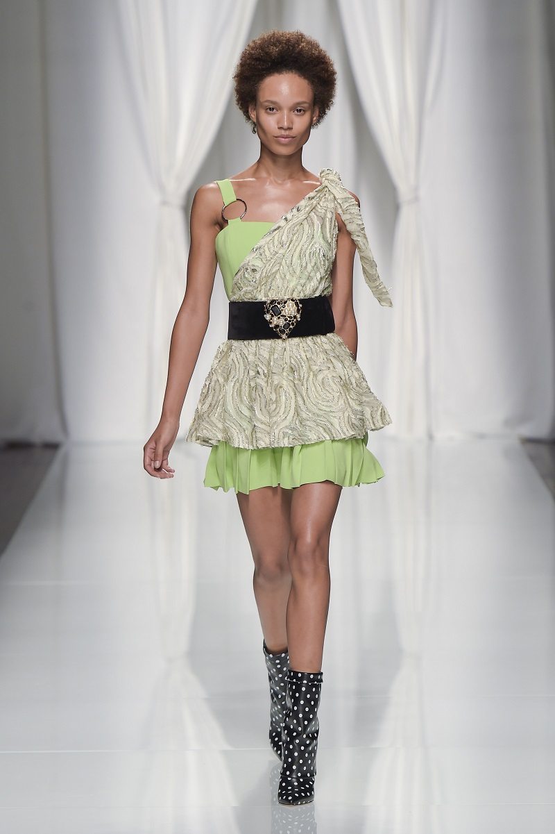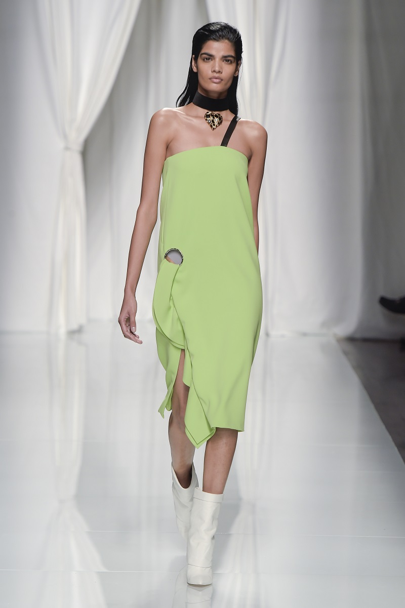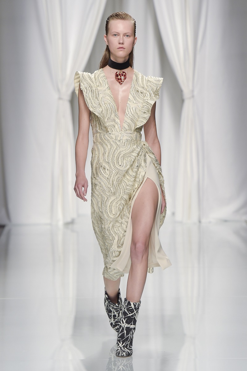 Gli anni 80 conquistano la scena, tra tute con rouches di seta color avorio, leggeri abiti plissettati verde acido e più strutturati dress segnati da un anello metallico sul fianco.