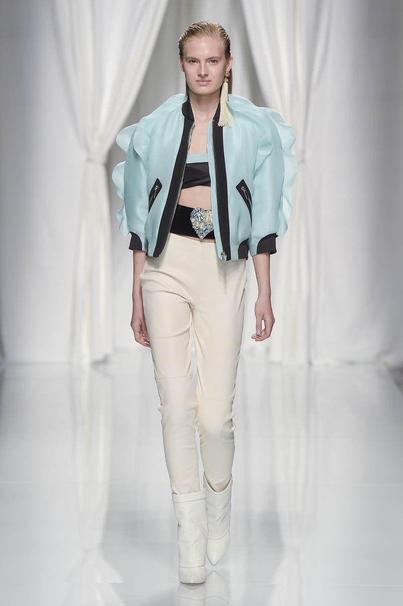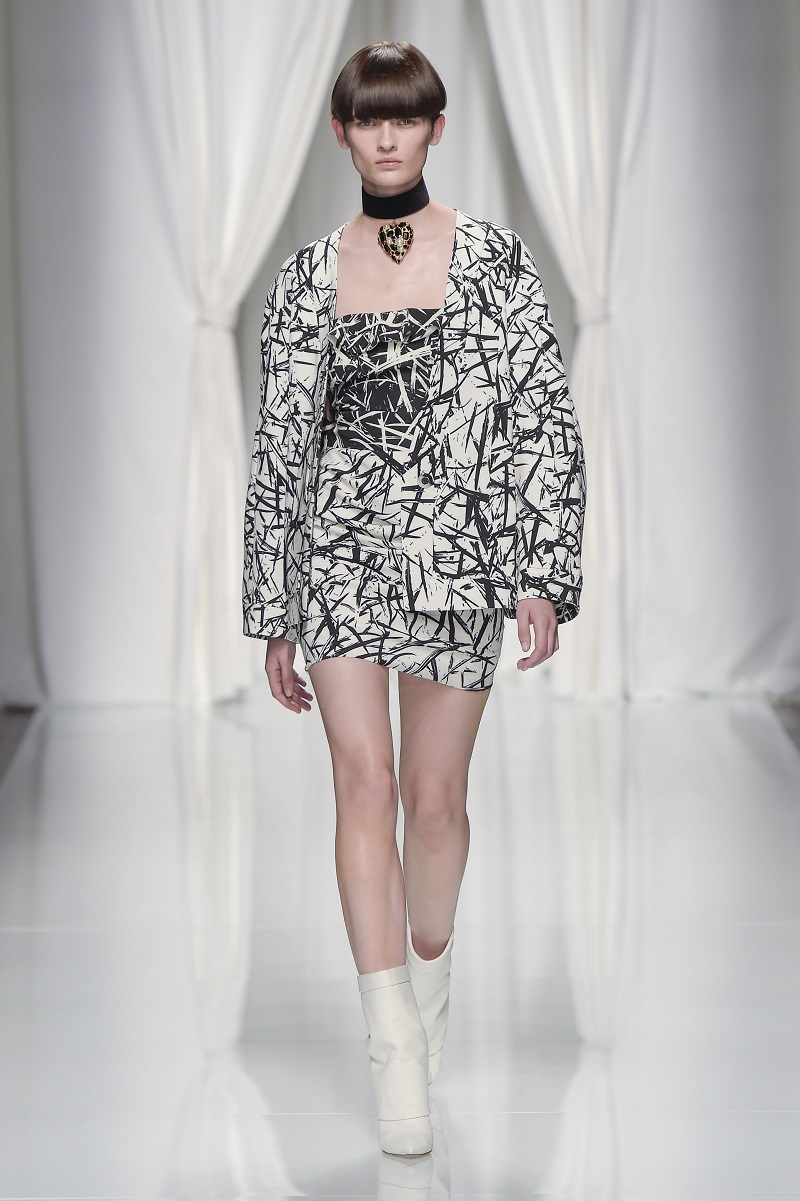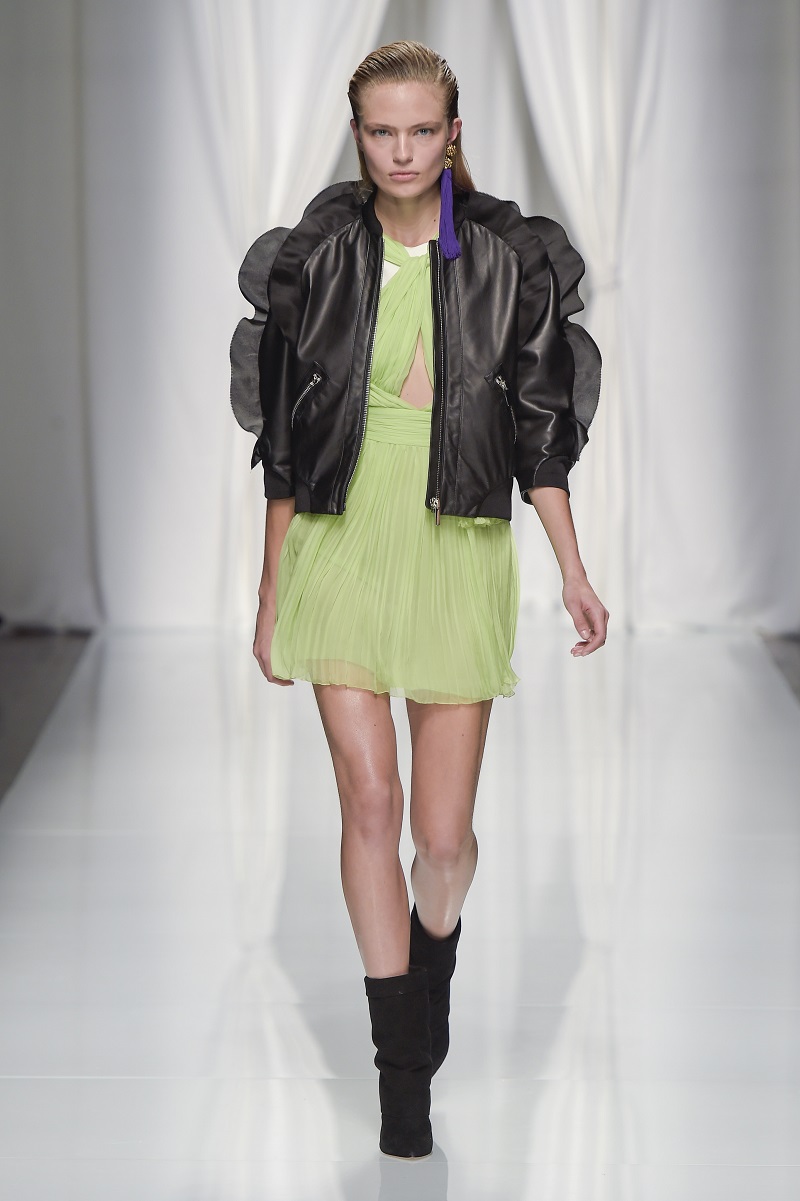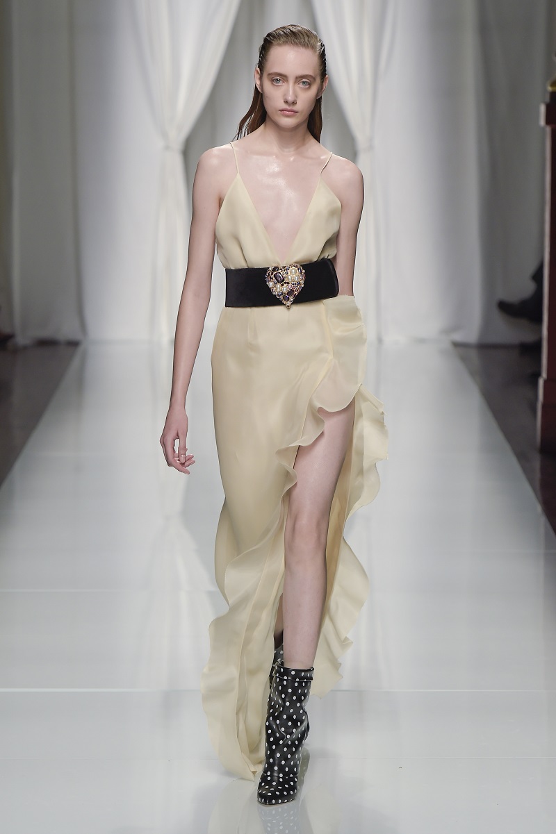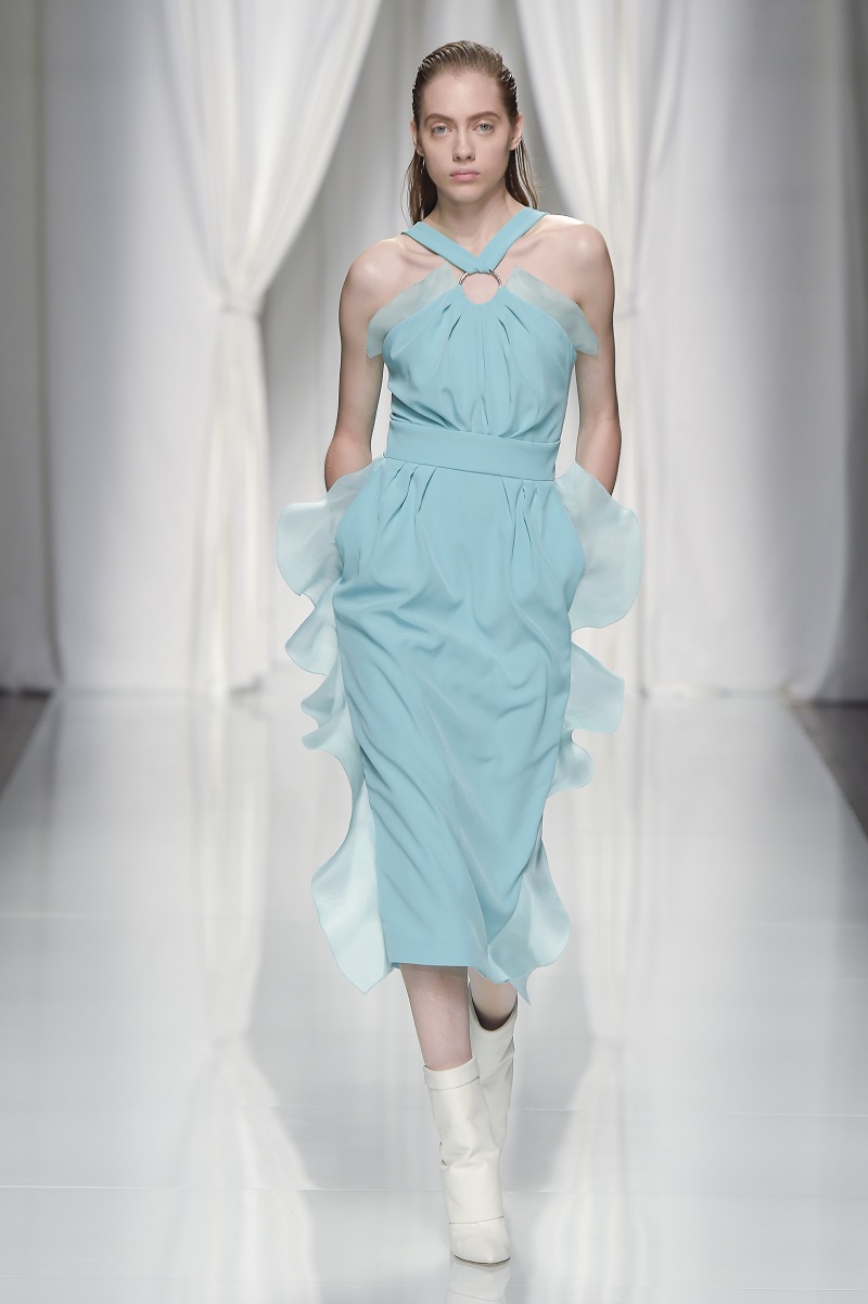 Gli anni 80 conquistano la scena, tra tute con rouches di seta color avorio, leggeri abiti plissettati verde acido e più strutturati dress segnati da un anello metallico sul fianco.