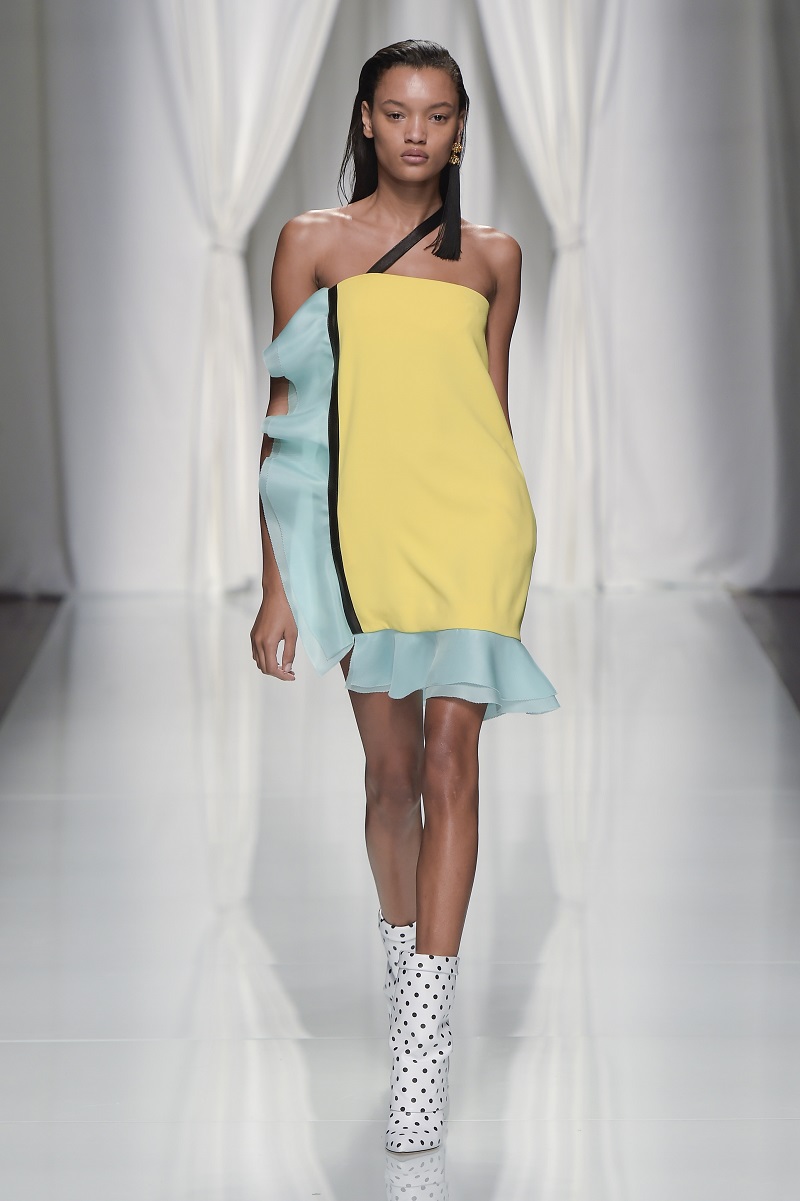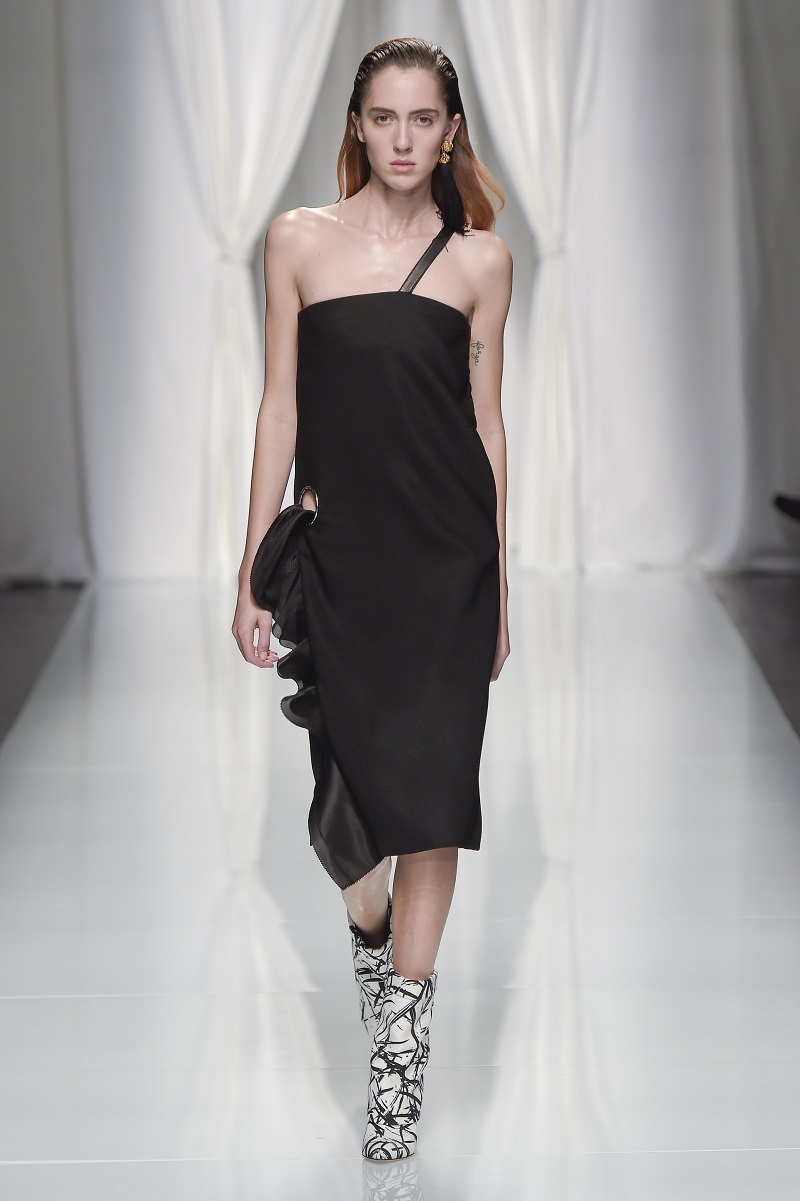 Il nero assoluto riveste i top architettonici a balze di gazar, le gonne di pelle e gli abiti dallo spacco profondo. Una monocromia che lascia presto spazio al colore.