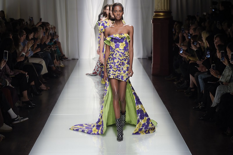 I primi look sintetizzano tutto. Le ruche da alta couture, le stampe, i grafismi e i romanticismi sono asciugati e si innestano sul color-block. I colli multistrato segnano la parte superiore del corpo e il fascino della borghesia, mentre tessuti come garza e crinoline sono usati anche di giorno, perché lo stilista vuole abbigliare chi sa portare la corona con un tocco di ribellione.