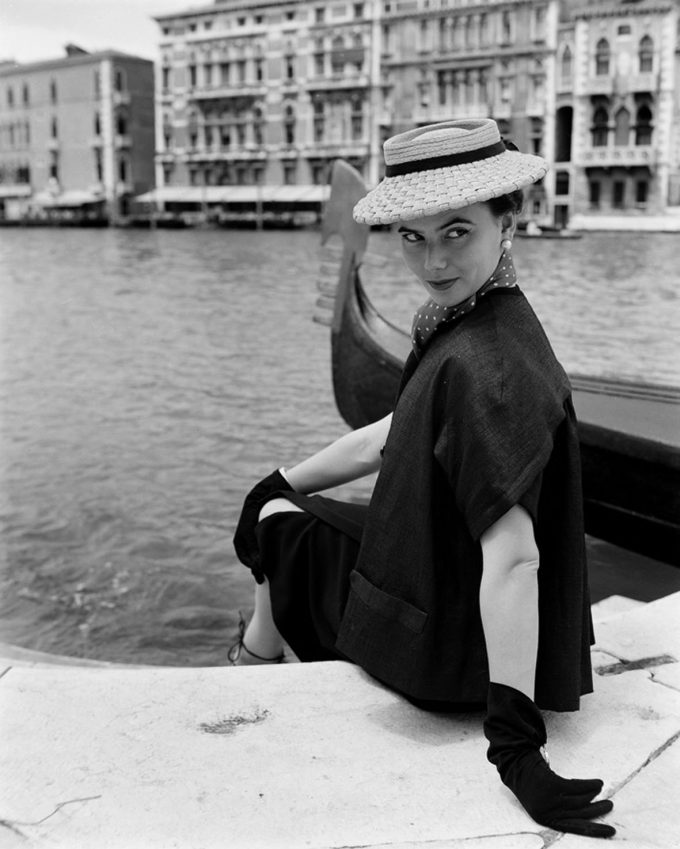 Per l’autunno, creò invece la linea “Princesse” in cui la vita dava l’illusione di estendersi sino a sotto il seno. Nelle immagini di Cameraphoto le bellissime modelle vestite da Dior duettano con Venezia. Canali, chiese, palazzi non sono mai un puro sfondo ma protagonisti alla pari delle creazioni del grande sarto.