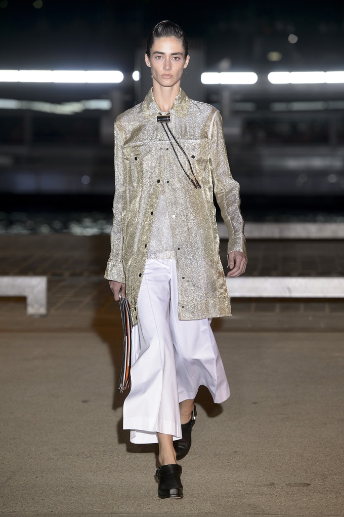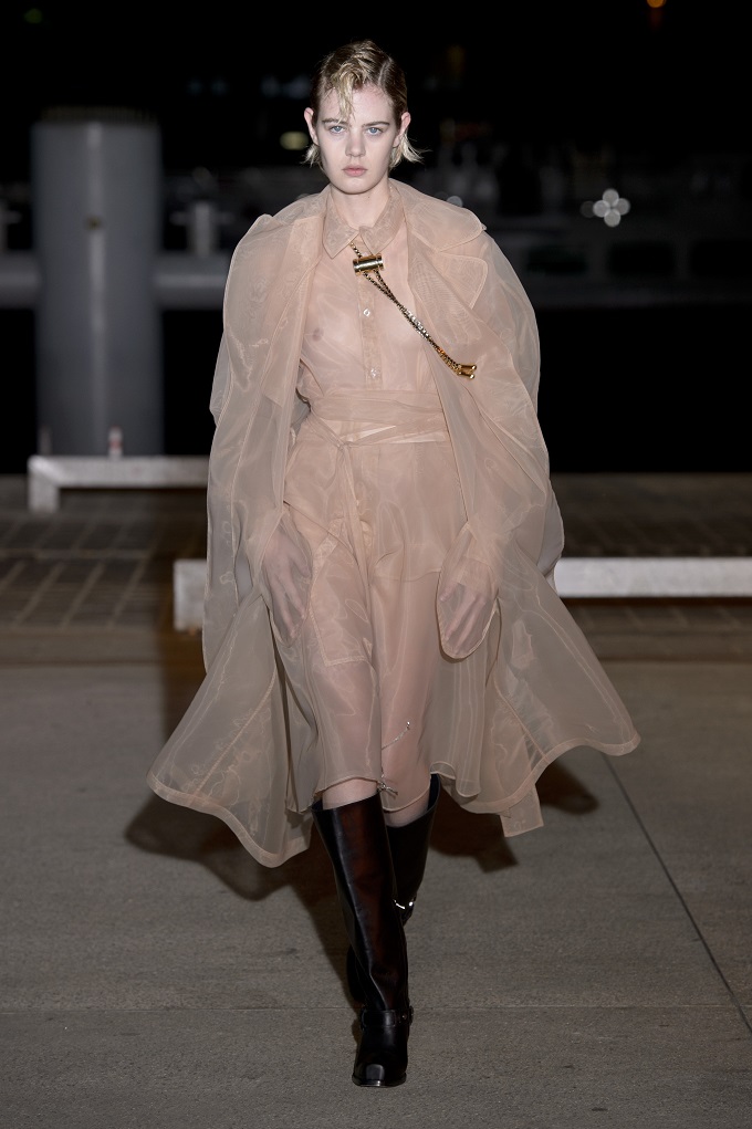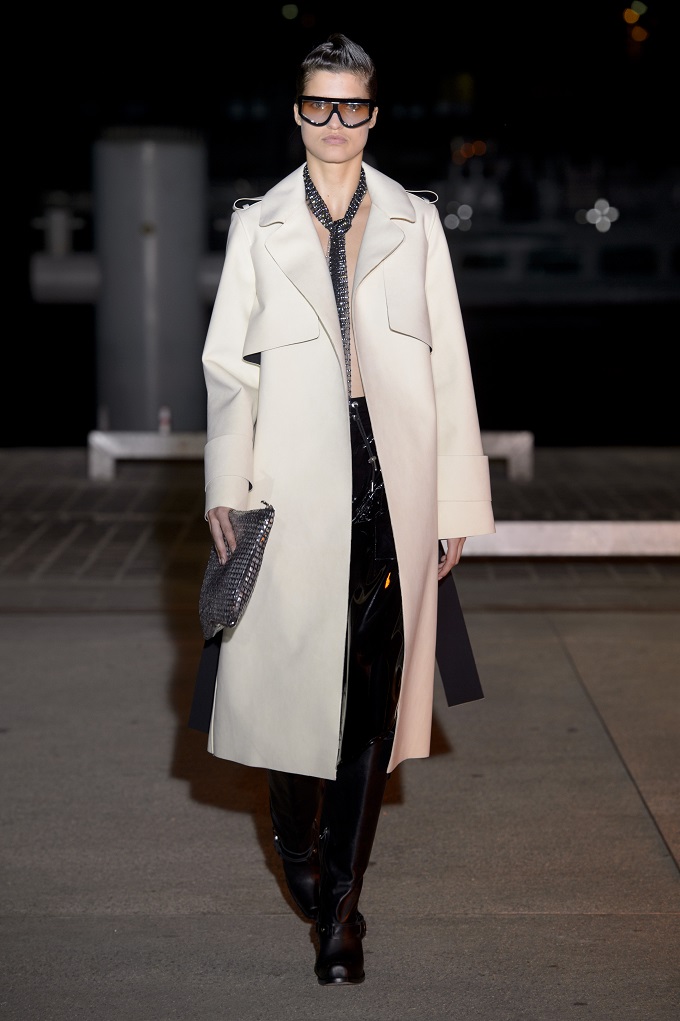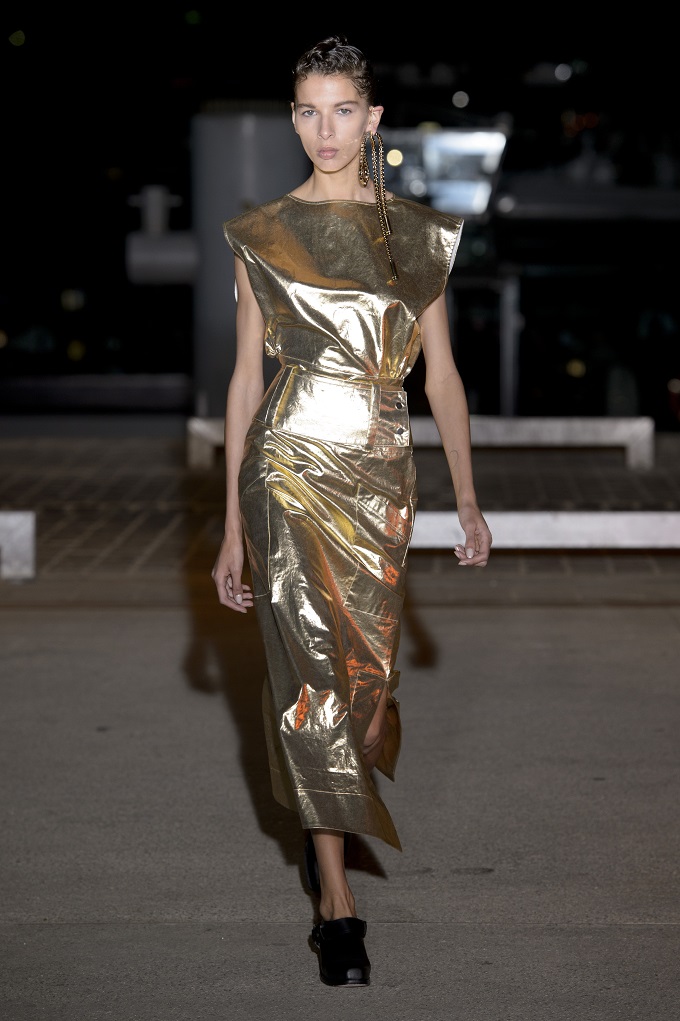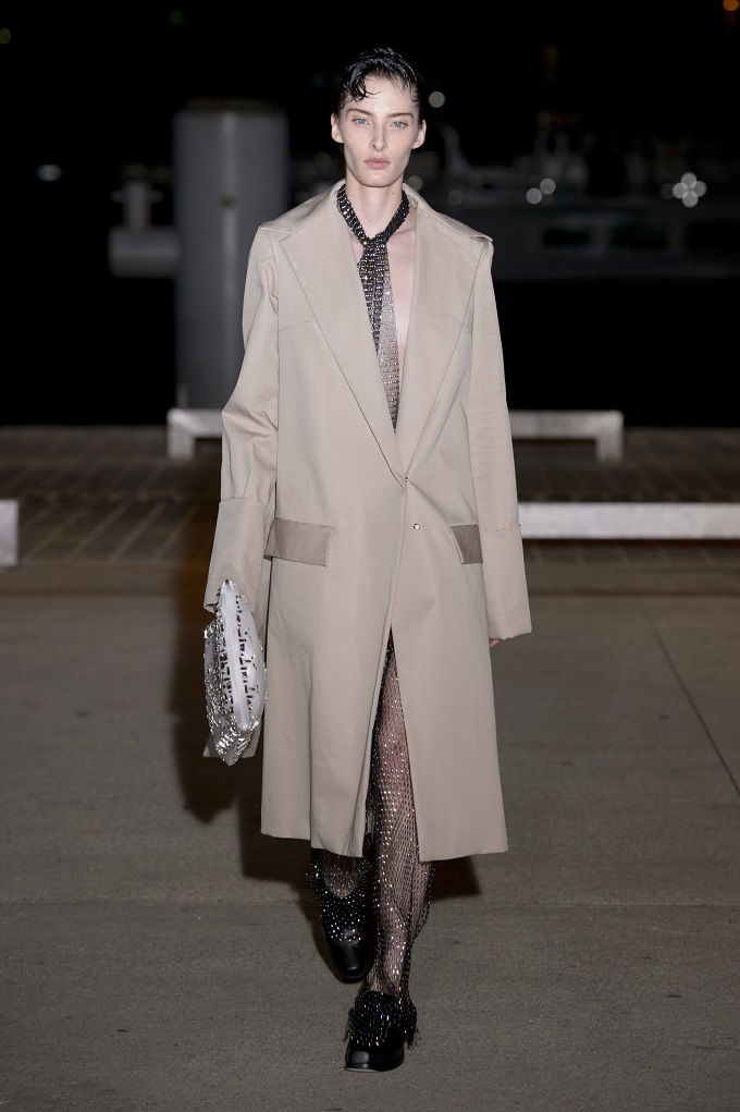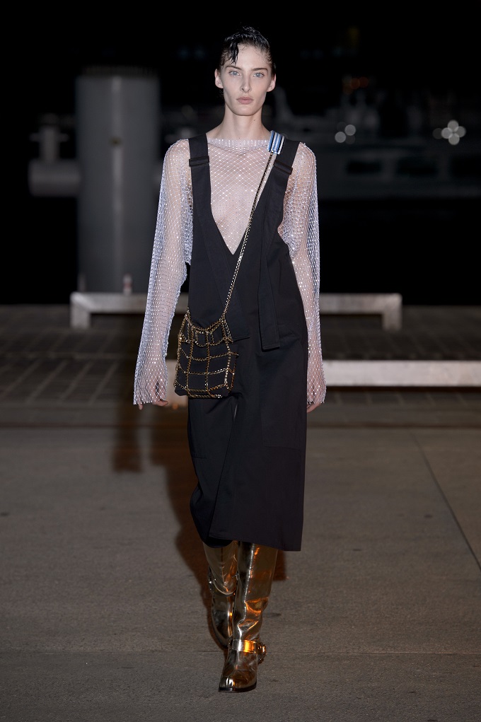 Il trench – capo con cui il progetto creativo ha avuto inizio – è affinato da drappeggi e inserti di organza. L’oro avvolge i gilet e i pantaloni indossati con booties a rete di vinile. Gli accessori sono futuristici, tra occhiali dalle geometri nette e borse a bauletto sorrette da catene.