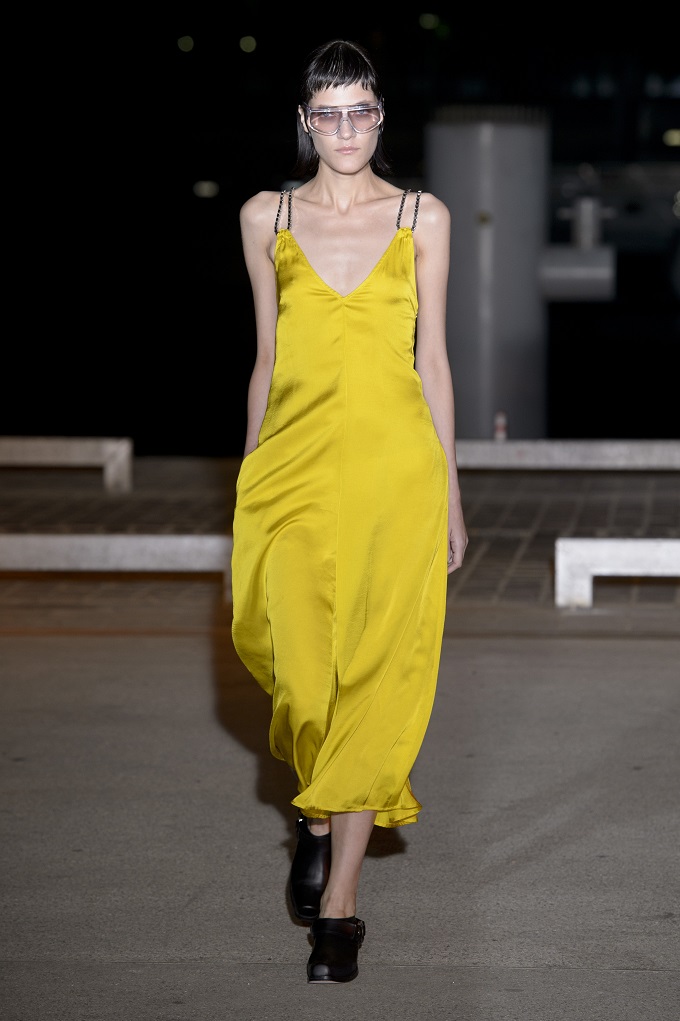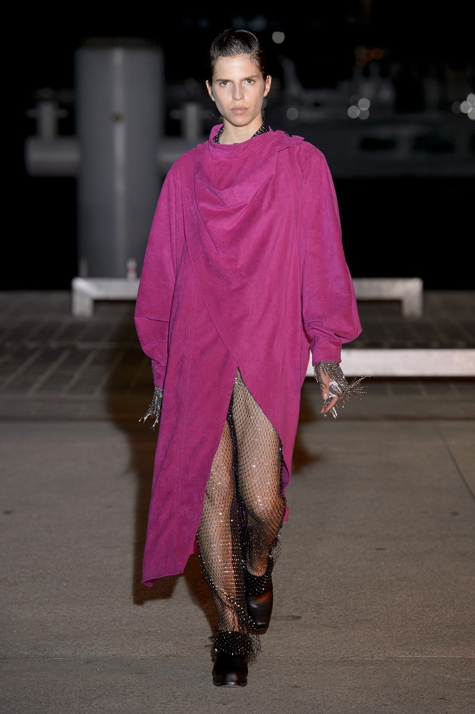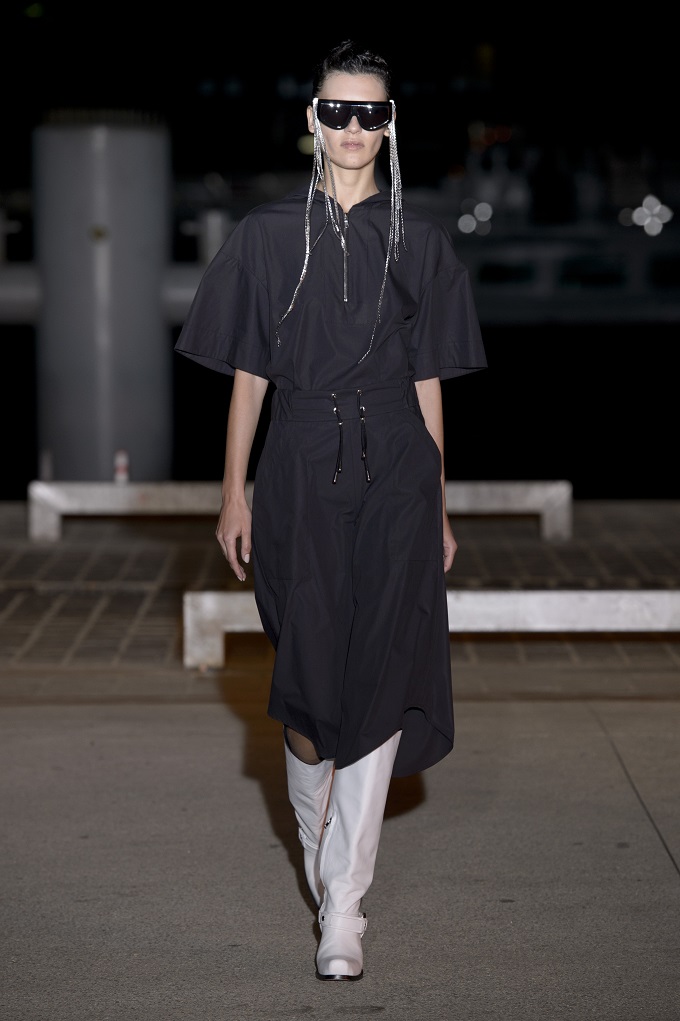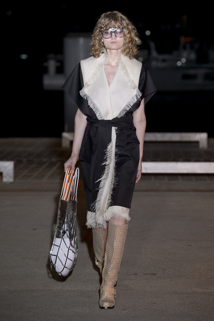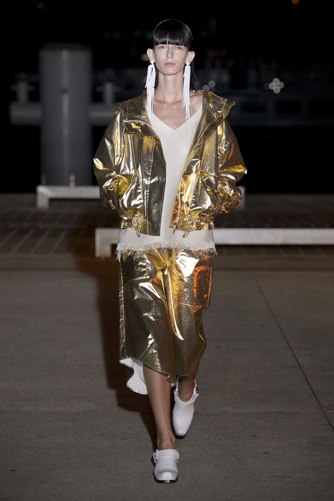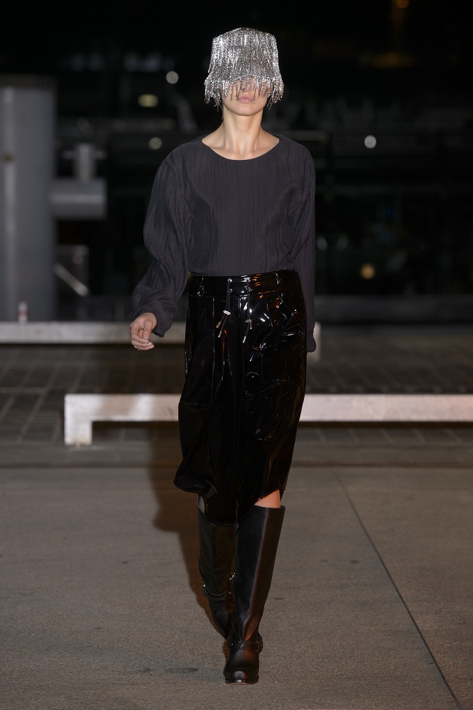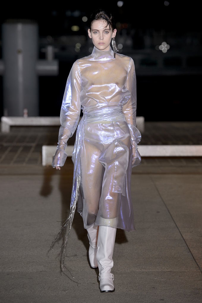 Il trench – capo con cui il progetto creativo ha avuto inizio – è affinato da drappeggi e inserti di organza. L’oro avvolge i gilet e i pantaloni indossati con booties a rete di vinile. Gli accessori sono futuristici, tra occhiali dalle geometri nette e borse a bauletto sorrette da catene.
