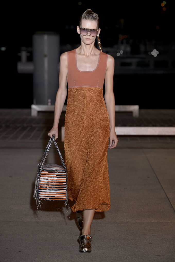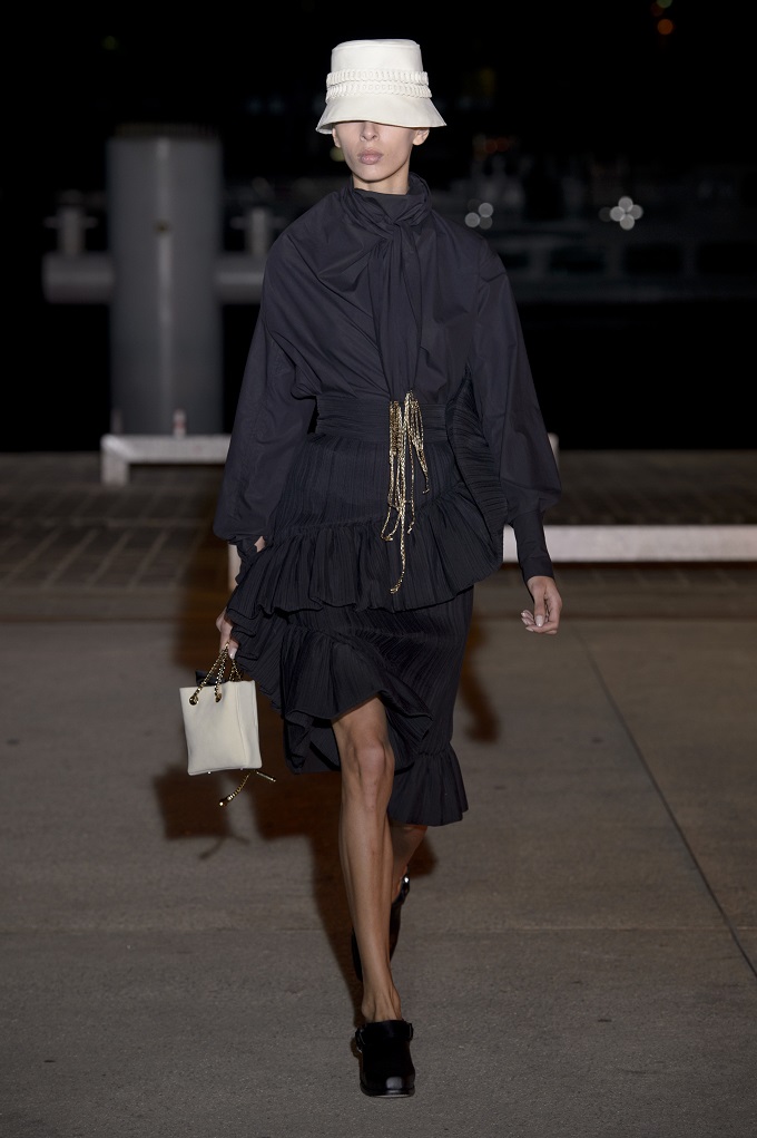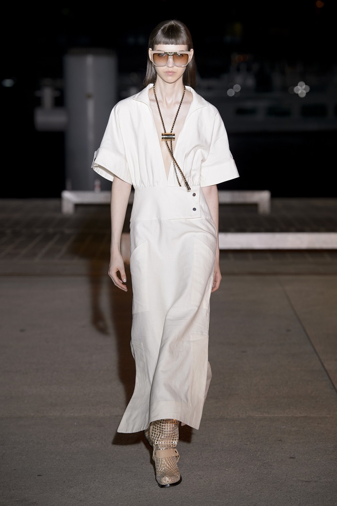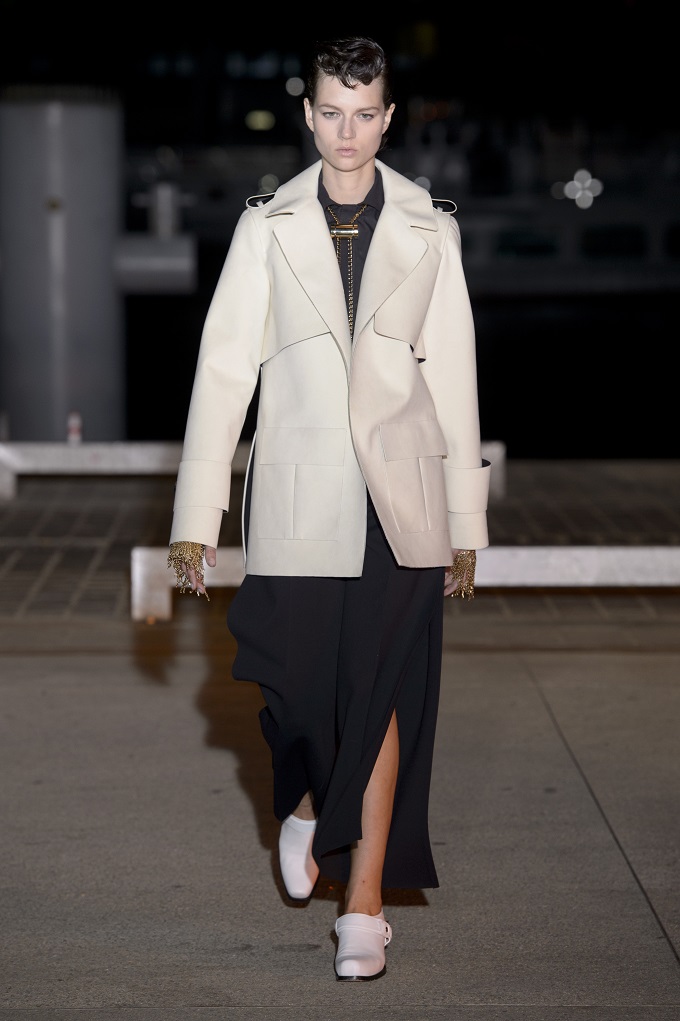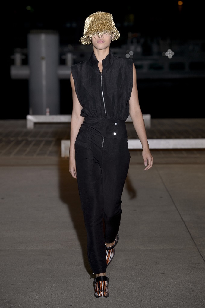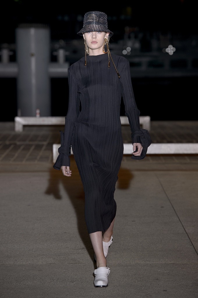Il trench – capo con cui il progetto creativo ha avuto inizio – è affinato da drappeggi e inserti di organza. L’oro avvolge i gilet e i pantaloni indossati con booties a rete di vinile. Gli accessori sono futuristici, tra occhiali dalle geometri nette e borse a bauletto sorrette da catene.