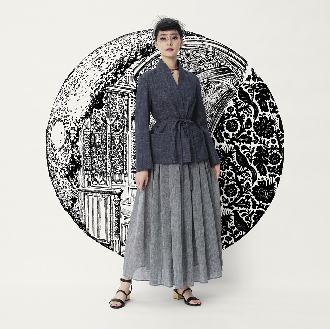 Yuko Araki wore a Dior Spring-Summer 2021 blue cotton and linen jacket with a grey light linen and cotton chambray skirt. She also wore a Dior veil and Dior sandals.